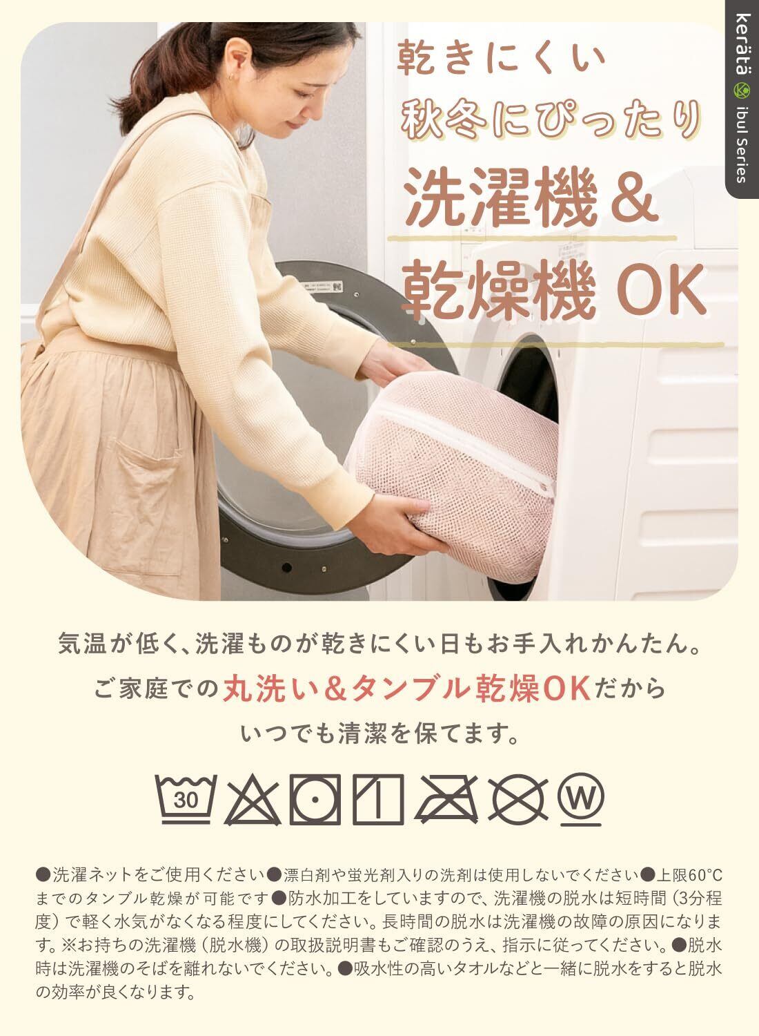 【お手入れらくらく 丸洗い&乾燥機OK】気温が低く洗濯ものが乾きにくい秋冬の寒い日や、お仕事で忙しい日もお手入れかんたん。ご家庭での丸洗い&タンブル乾燥OK(上限60℃まで)だからいつでも清潔を保てます。