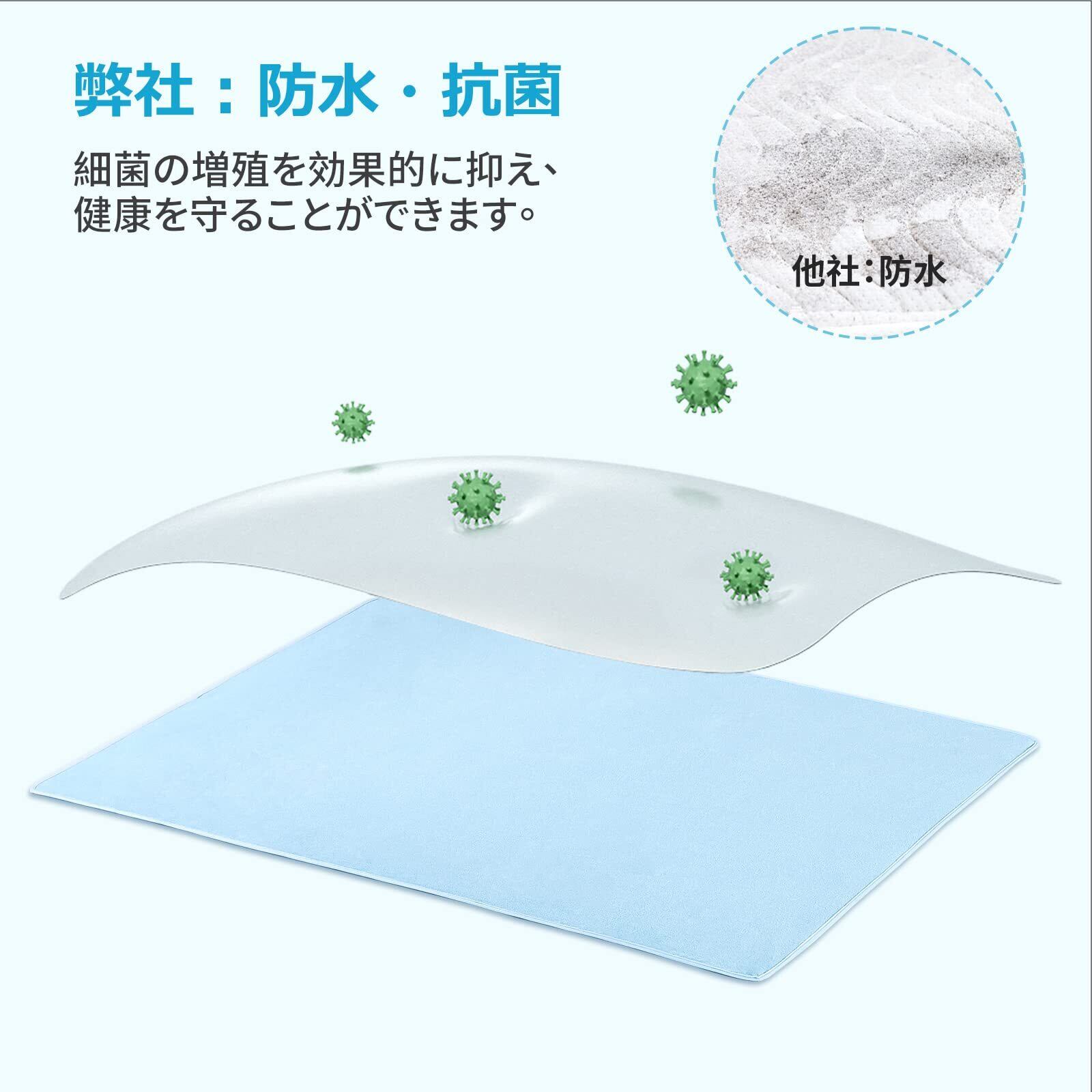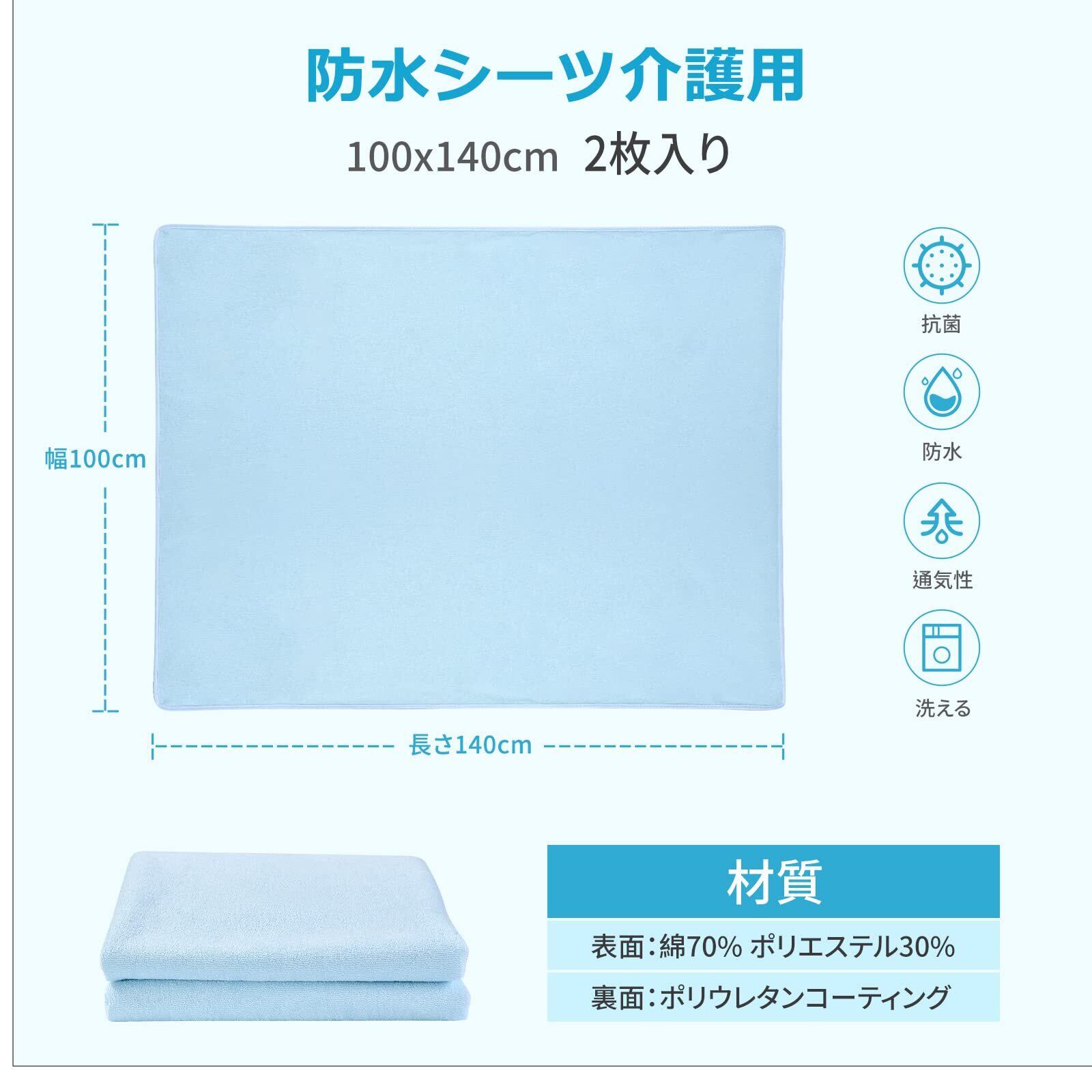 【2枚組丸洗いOK】この防水シーツは100×140cmの2枚セットで、ベッドの面積を広くカバーするので、普段の交換も簡単です。また、日常のお手入れの際に、洗濯機で直接洗うことも可能です。ご注意:洗濯ネットに入れて洗い、脱水や乾燥機の使用はしないでください。また、電気毛布との併用もご遠慮ください。