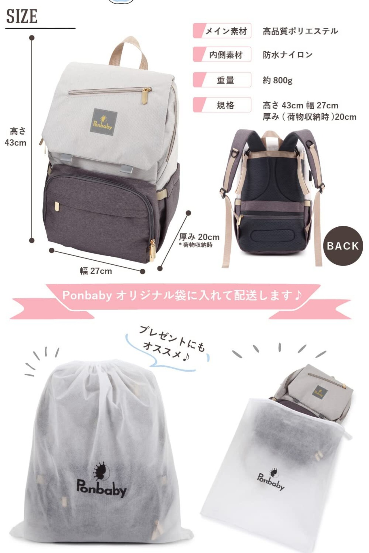 [Ponbaby] マザーズリュック ベーシックモデル (大容量 / 16のポケット) マザーズバッグ リュック 軽量 多機能 USBポート付き 出産祝い プレゼント