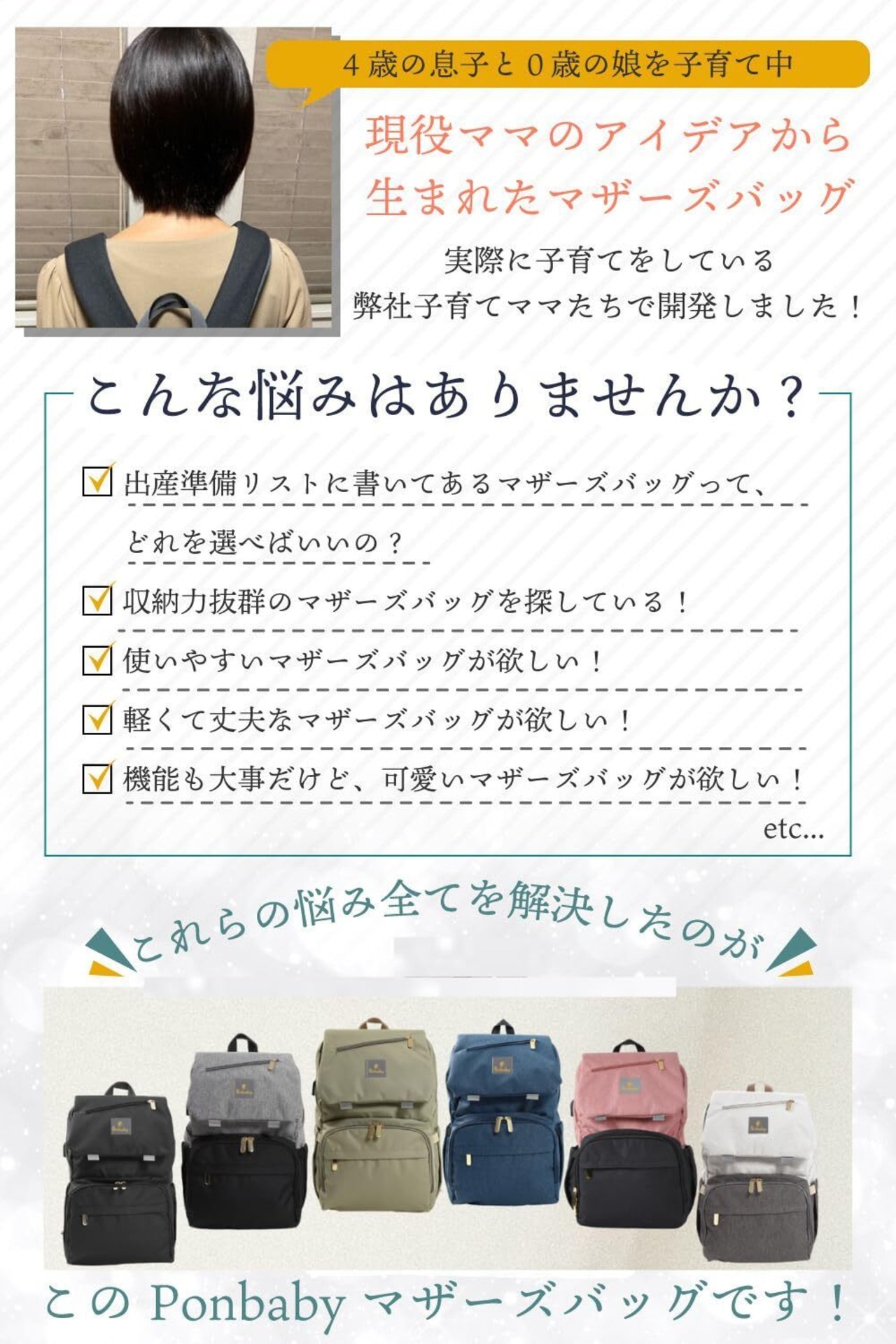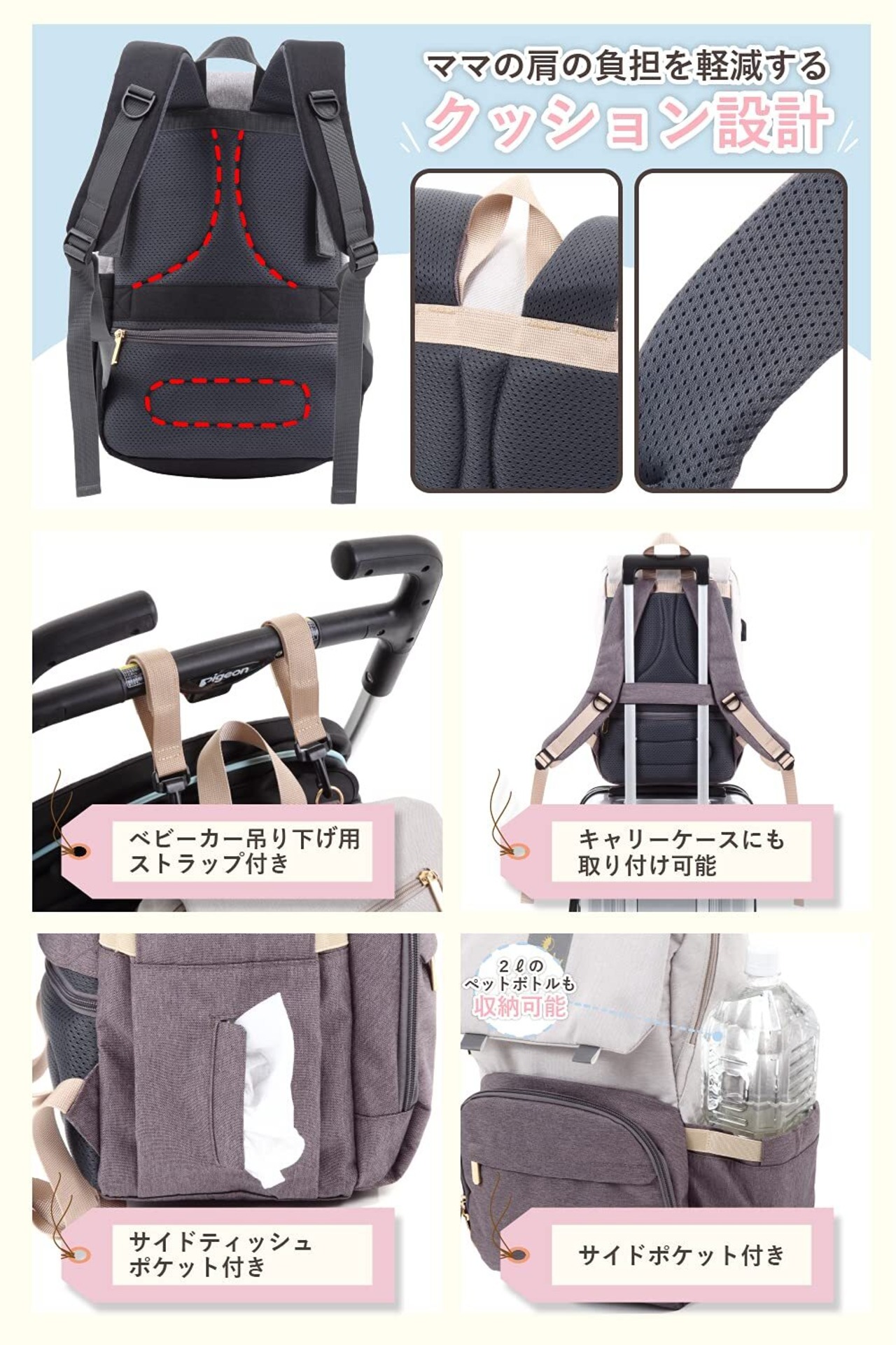 【肩と背中に優しくフィット】身体にフィットして、肩や腰の負担を軽減するクッション設計。ベビーカーやスーツケースのハンドルに取り付けできるので、外出時のストレスも軽減します。おしゃれなデザインで出産祝いのプレゼントにも。
