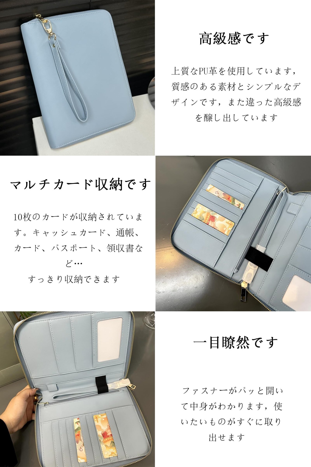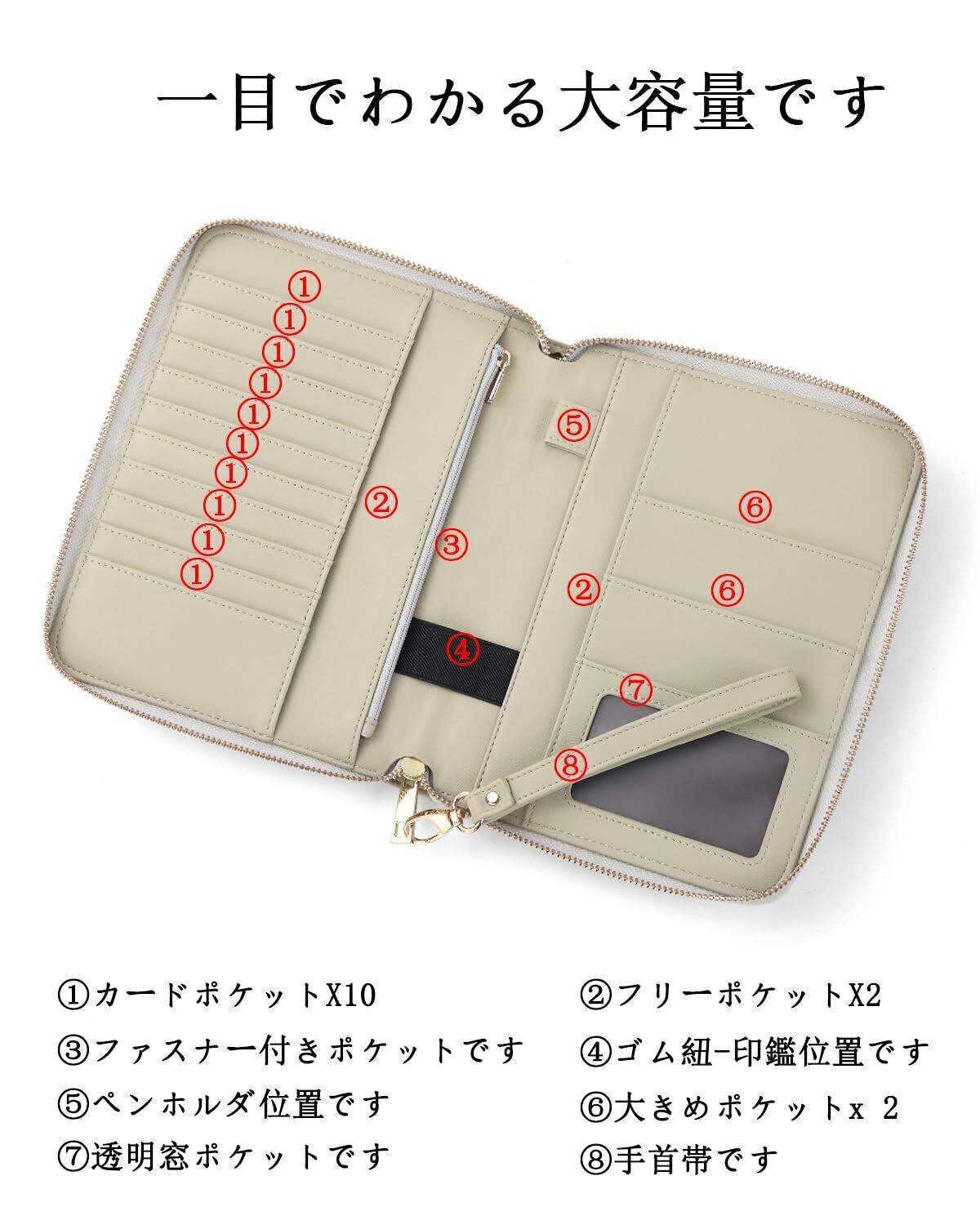 【多機能、大容量の収納スペース】①カードポケットX10 ②フリーポケットX2 ③ファスナー付きポケットです ④ゴム紐-印鑑位置です ⑤ペンホルダ位置です ⑥大きめポケットx 2 ⑦透明窓ポケットです ⑧手首帯です