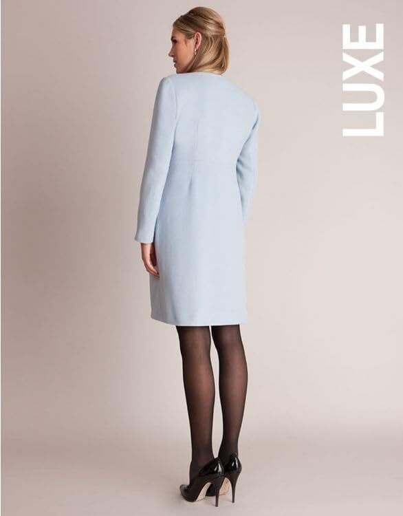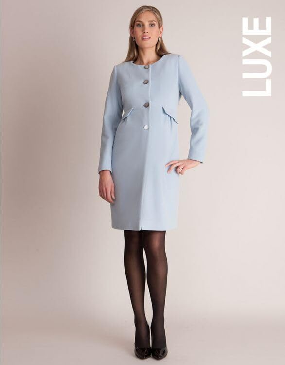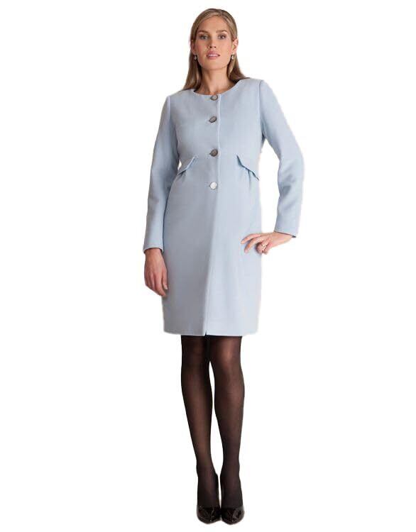 高品質のバージンウールとカシミアを使用した肌触りの良いパステルブルーのマタニティコート。
