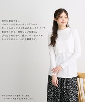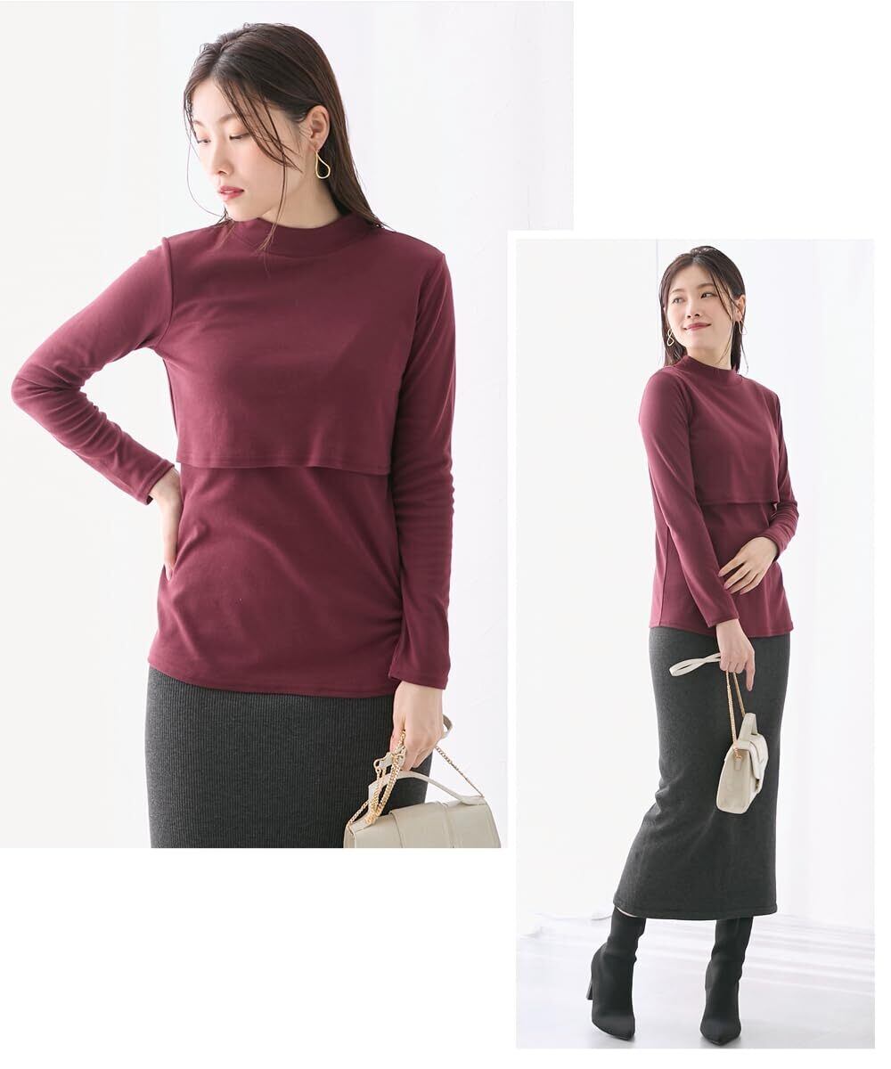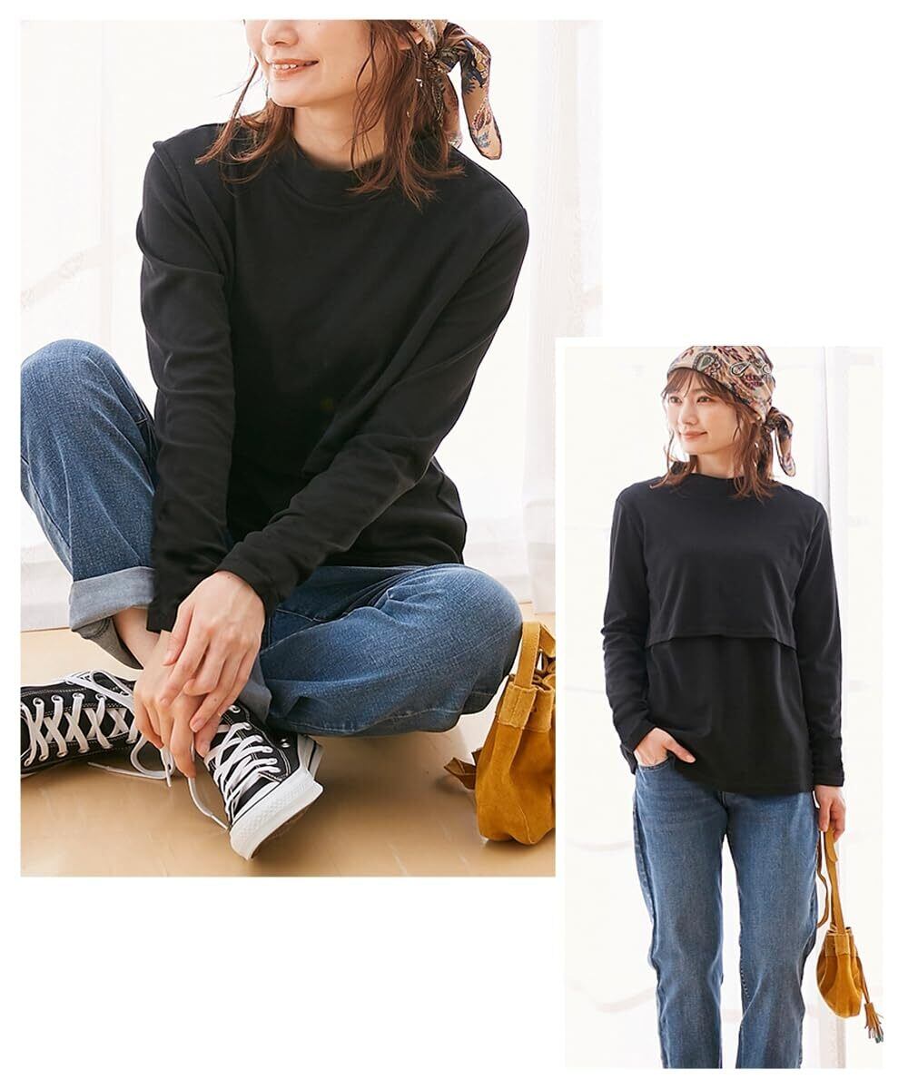 授乳のしやすさが先輩ママに好評のTシャツシリーズ秋冬のスタイリングに重宝する、ベーシックなモックネック(ハイネック)タイプ
