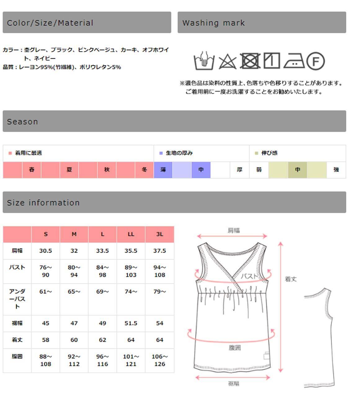 サイズ(cm):S(肩幅30.5,バスト76-90,アンダーバスト61-,裾幅45,着丈58,腹囲88-108,), M(32,80-94,65-,47,60,92-112), L(33.5,84-98,69-,49,62,96-121), LL(35.5,89-103,74-,51.5,64,101-121),3L(37.5,94-108,79-,54,64,106-126)
