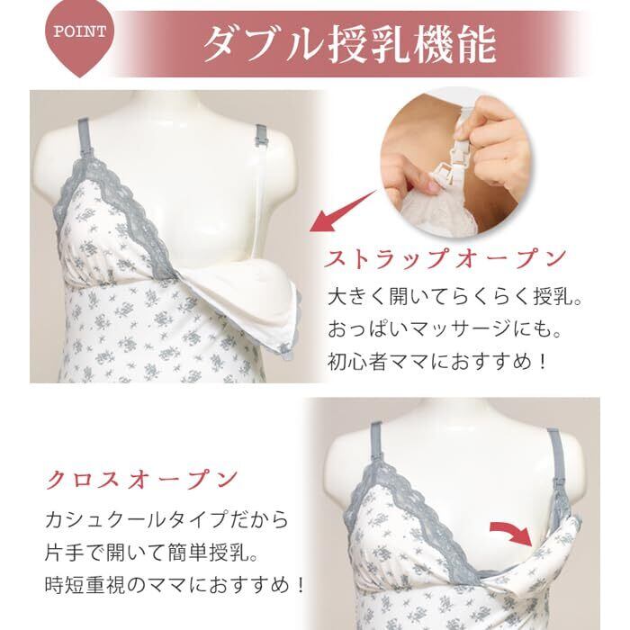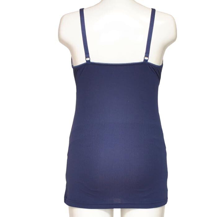 身生地には、縦横に伸縮性のある天竺素材を使用。授乳機能は、ストラップオープンとクロスオープンの2通りで授乳できます。取り外し可能なカップ付き。アンダーはフロント部分にゴムが入り、ストラップの丈調節も可能なのでボディにやさしくフィット。臨月も安心な着丈で、ボトムインにも快適なすっきりシルエットです。カップを取り外しブラの上から重ね着使いも可能。通年で体温調節にお使い頂けるアイテムです。