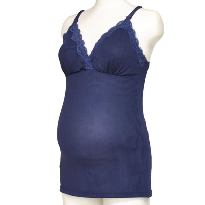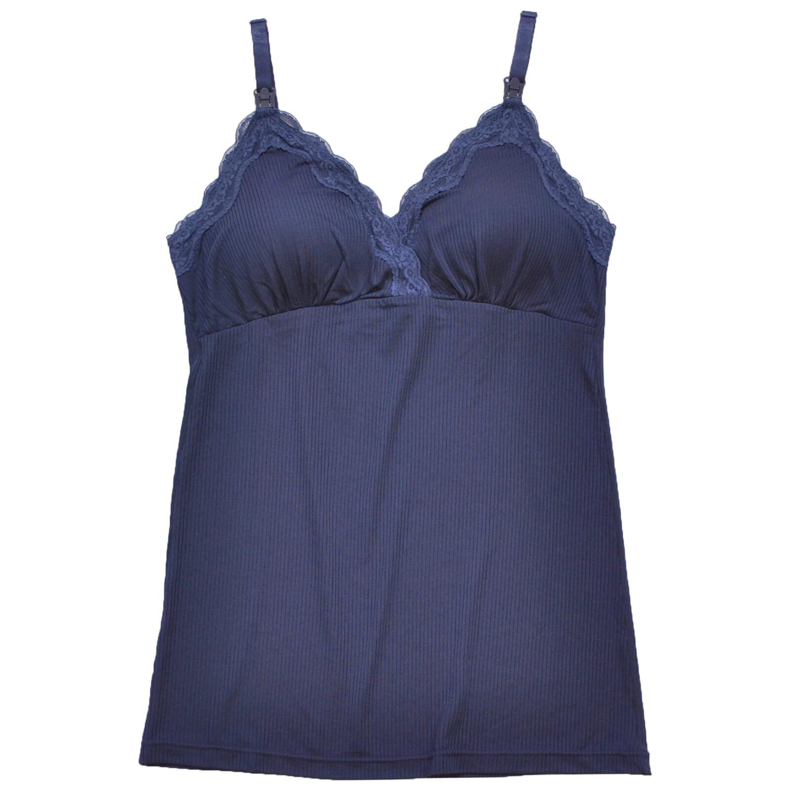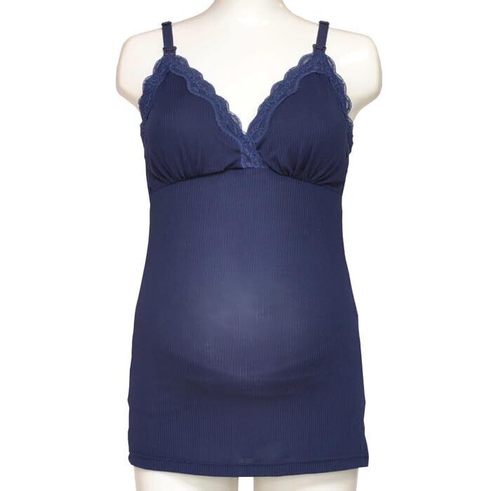 襟ぐり袖ぐりに贅沢なレースをあしらったカップ付き授乳キャミソール