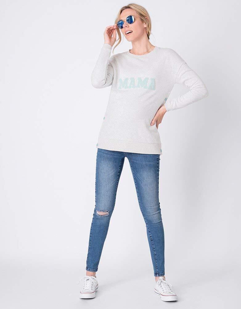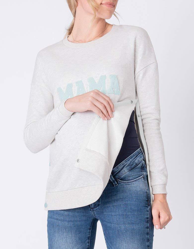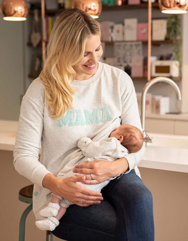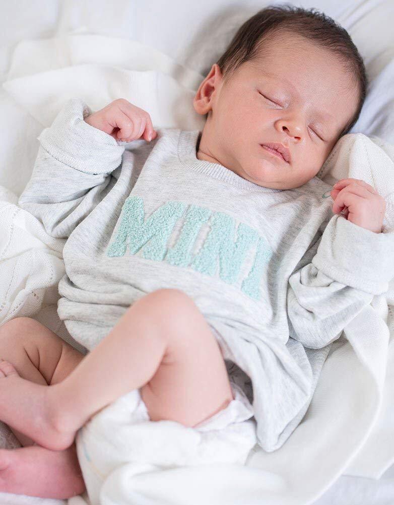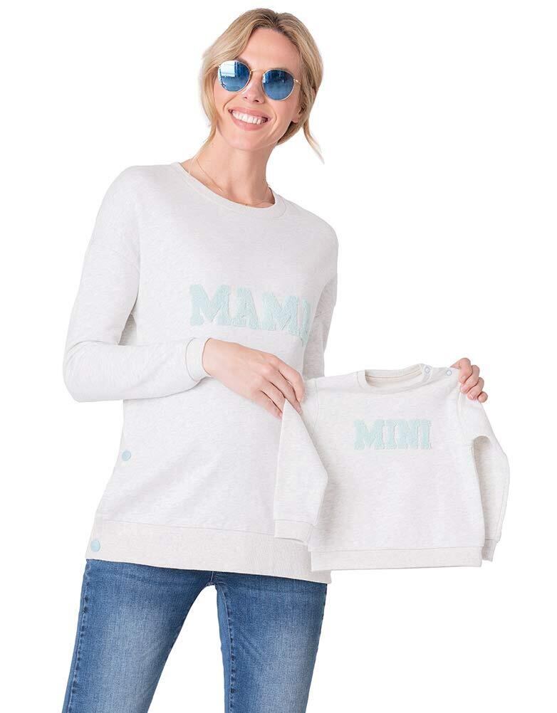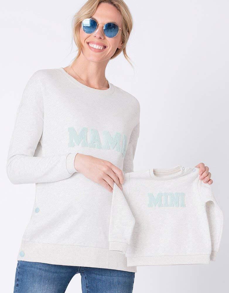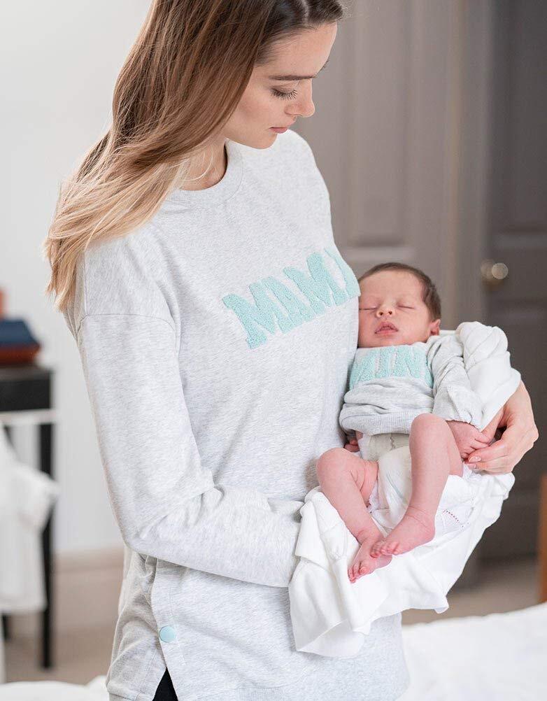 イギリスブランドSeraphine(セラフィン)のママとベビーのトップスのセットアイテム。グレイメランジカラーのとろみのある柔らかい薄手スエットのママ用トップとベビー用のトップがセットになった、可愛いアイテム。ママ用のトップはサイドにデザインされたポッパーボタンを外せば簡単に授乳可能な優秀デザイン。ご妊娠中はもちろん、産後は授乳服としてご利用頂けます。ママのトップにはパステルグリーンのパイル起毛になった<ママ>のロゴメッセージ、ベビー用のトップには<ミニ>のロゴメッセージが入って、とてもキュート。ママとベビーでお揃いでお写真撮影やギフトにもおすすめです。 ベビーは新生児0-3ヶ月用のワンサイズ。ベビートップは肩にスナップボタンがついているのでお着替えも簡単。