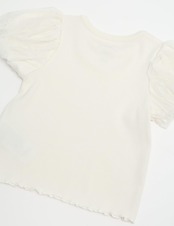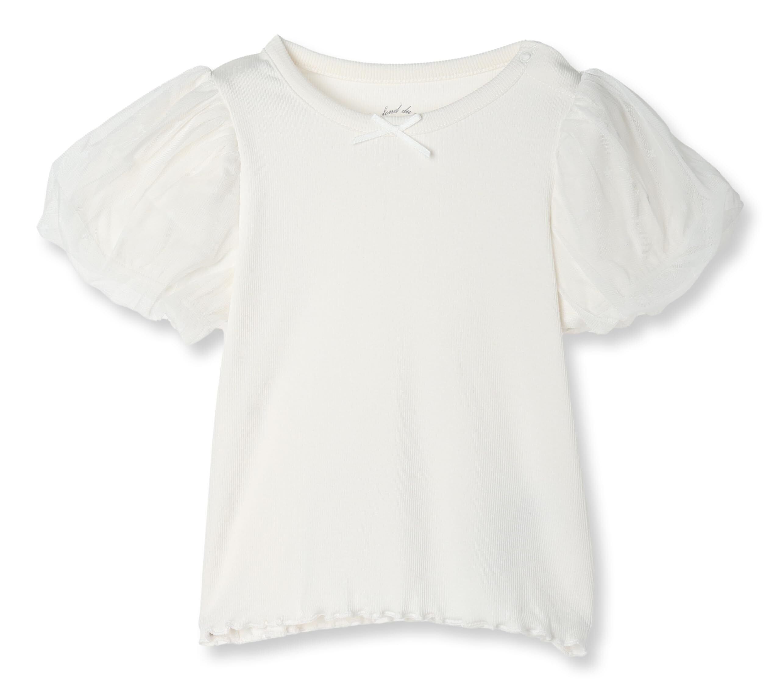 ボリュームたっぷりのパフスリーブが愛らしく、胸元の小さなリボンや、左袖に施されたロゴ刺繍など、細部までこだわりが光ります。