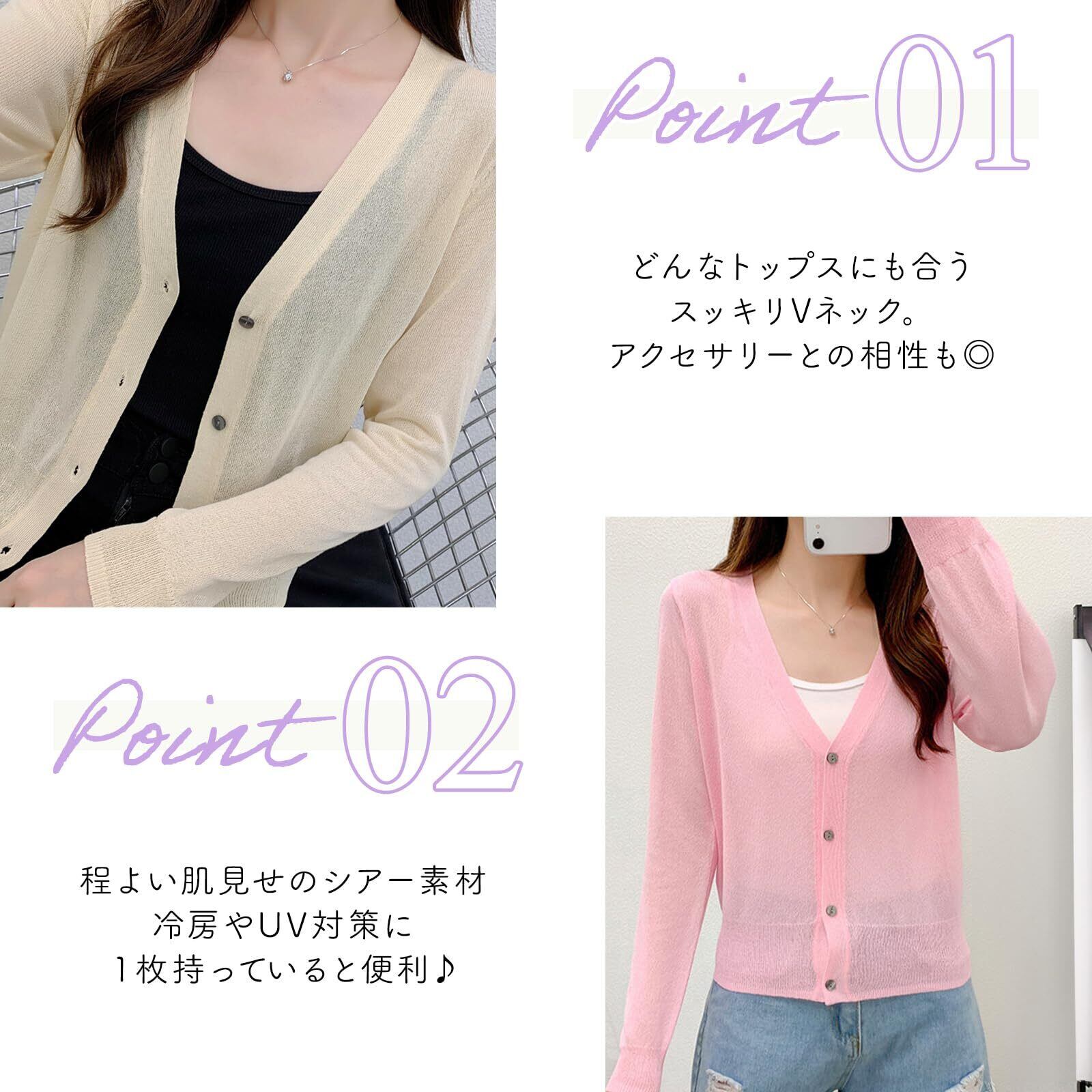 薄手の少し透け感がある素材が肌をきれいに上品に魅せてくれます。ちょっとしたお出かけから毎日の通勤、通学までデイリー使いにとても便利なカーディガンです。電車やオフィスでの冷房対策にもおすすめでしわにもなりにくい素材ですので大活躍すること間違いなし!!軽量で持ち運びも便利ですよ