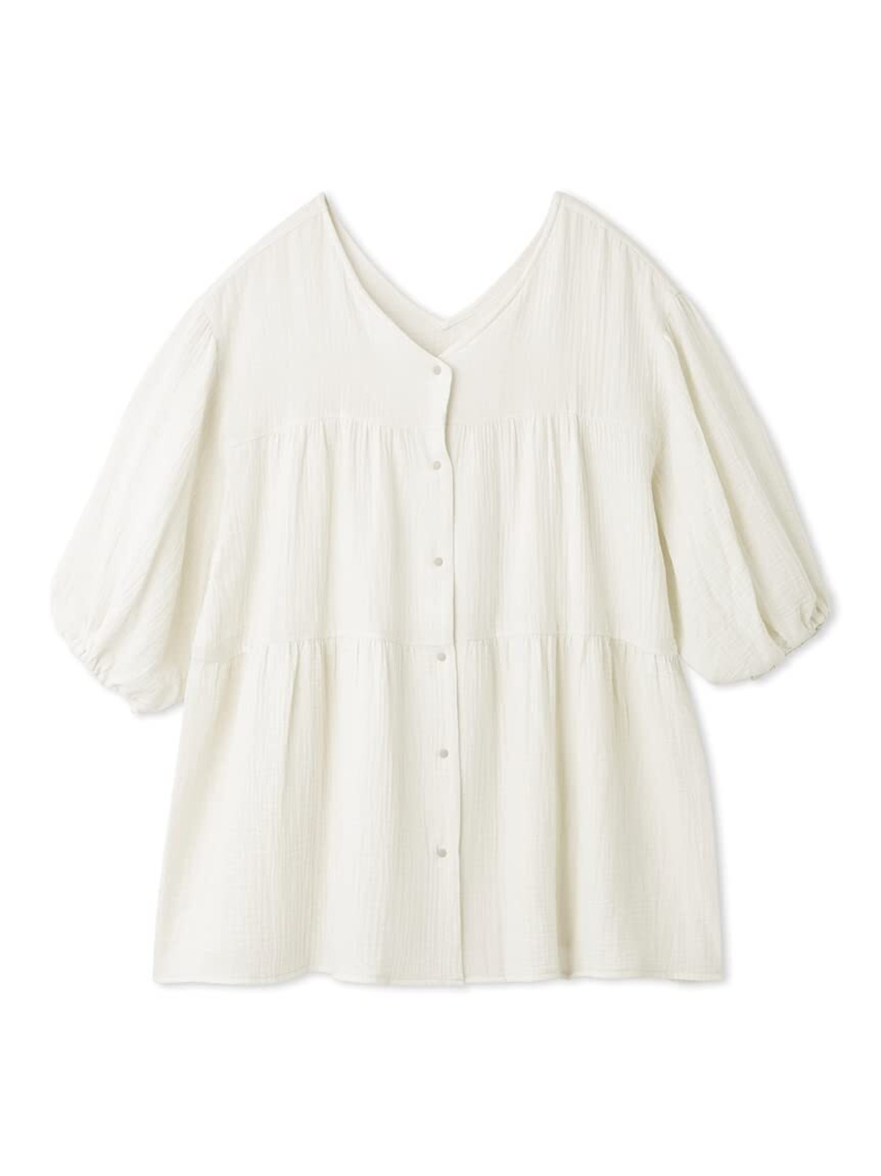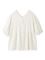 やわらかなコットン100%を使用した、マタニティのためのガーゼ素材シリーズです。ゆったりと締め付け感のないVネックのティアードプルオーバーは、前後2WAYでコーディネートできる優れもの。産前はスナップボタンを後ろ側にしてゆったり、授乳時期は前開きにして着用するなど、その時のスタイルに合わせた着こなしができます。肘下の袖は袖口にゴムが入っているので、さっとワンタッチでまくれるのも便利。色は淡いピンクと涼しげなミントをご用意しました。お揃い素材のロングパンツとのコーディネートもおすすめです。