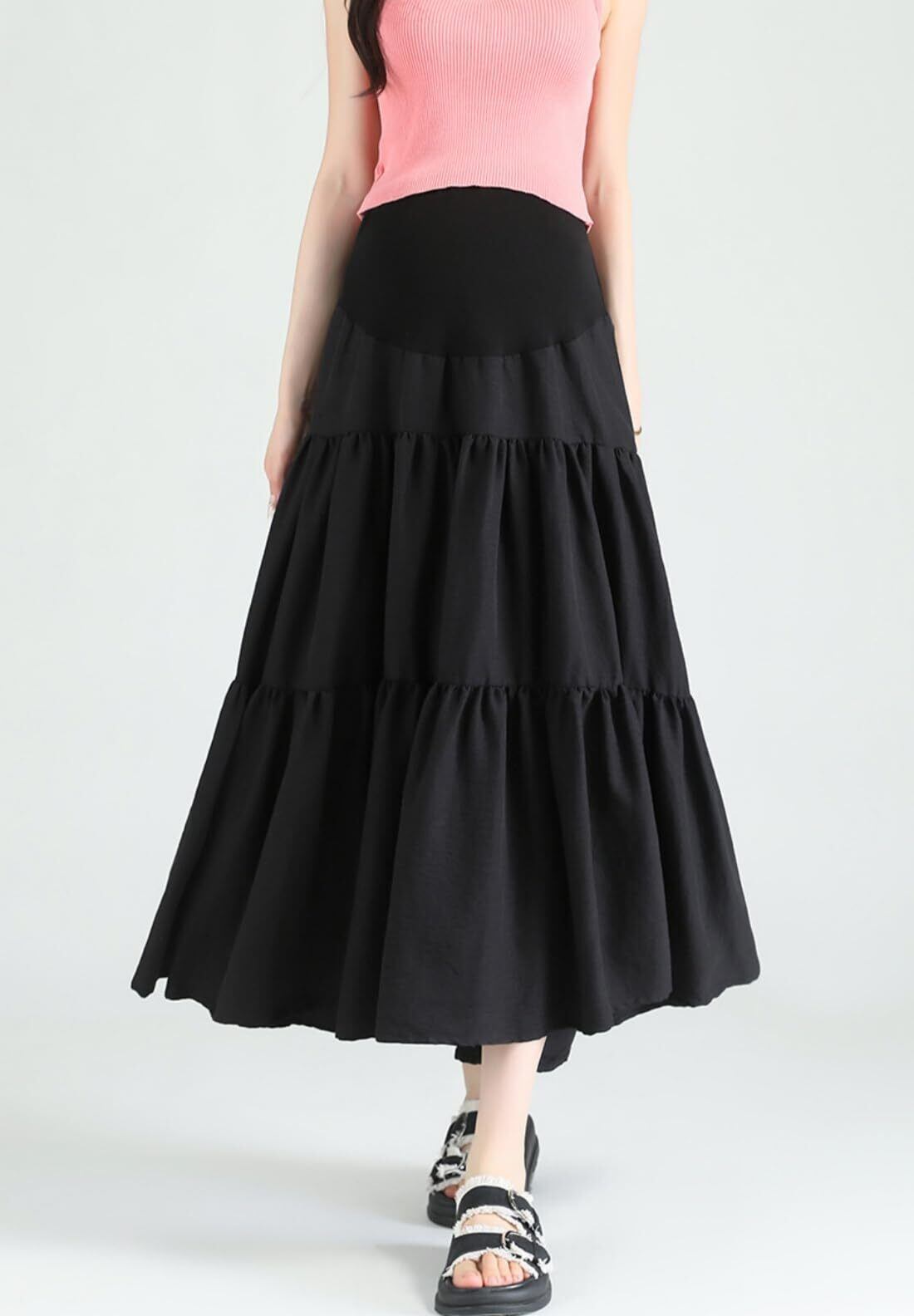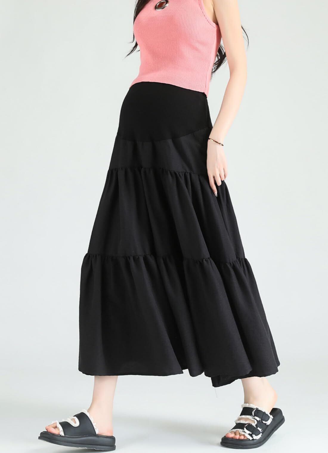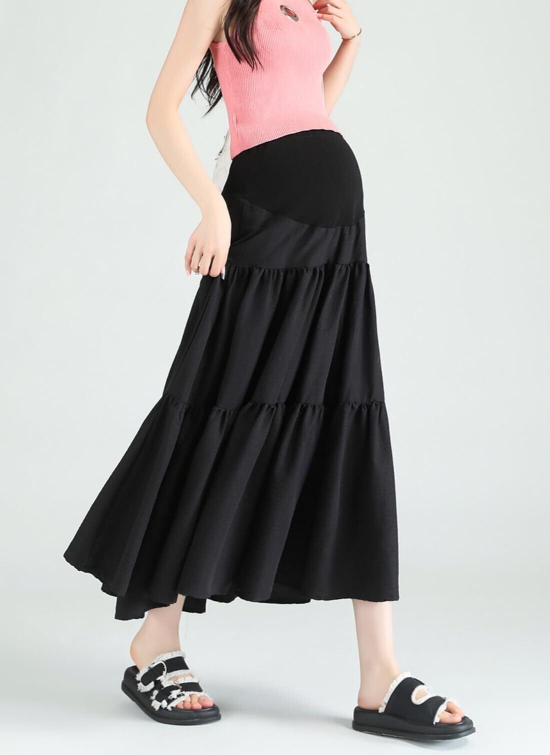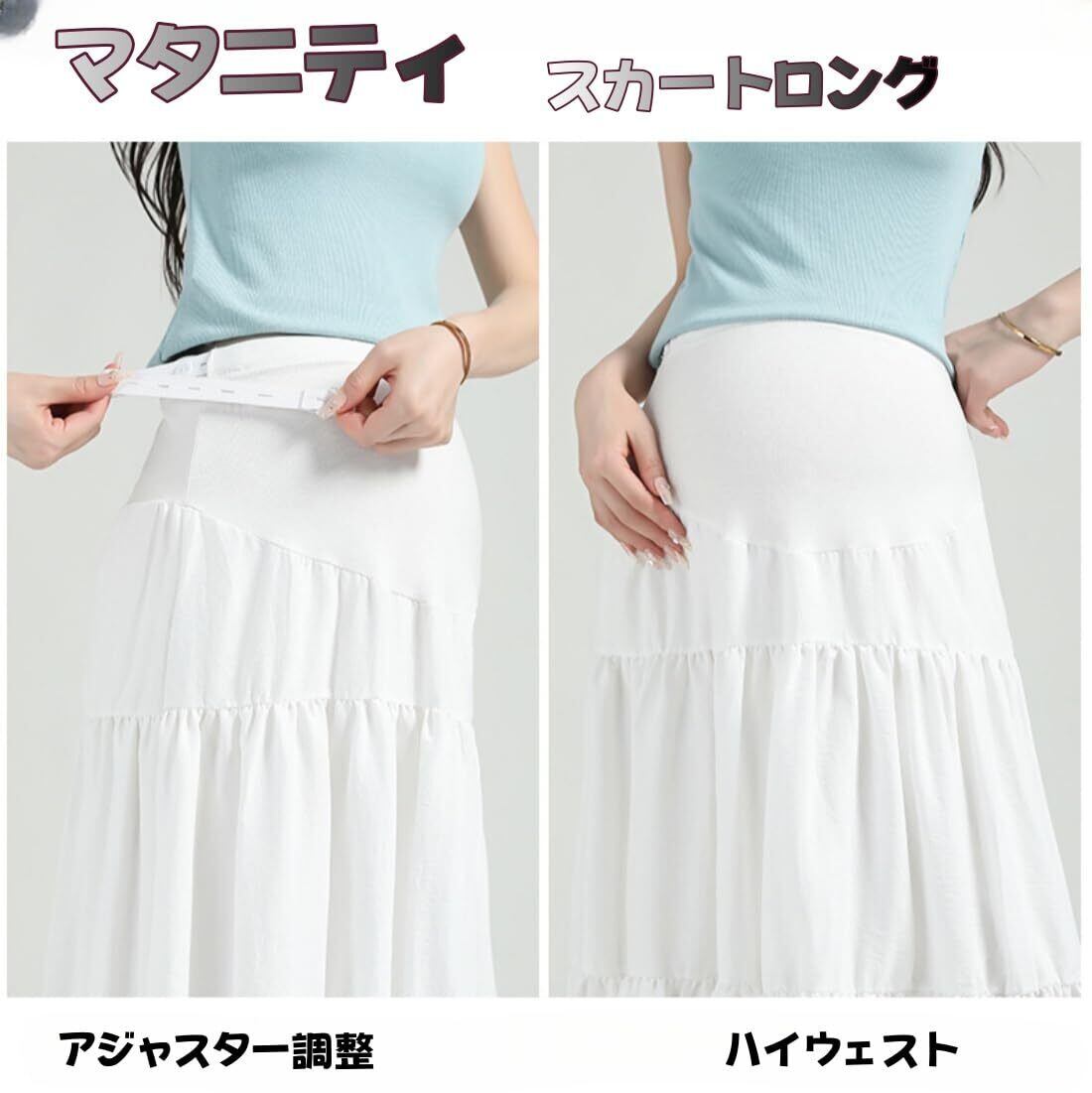 体型変化に優しいハイウエスト設計:お腹を優しく包み込む高弾性ハイウエスト仕様で、ウェストにアジャスター付きでサイズ調節可能なため、妊娠初期から臨月までフィット感をキープ。産後の体型戻し期間も活躍な妊娠スカートです。