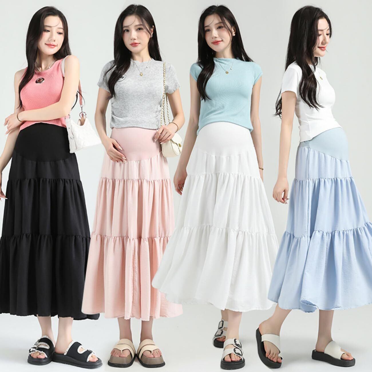 垂れ感のある生地が脚のラインをスラリと見せ、妊婦でもおしゃれな着こなしを実現。シンプルなデザインでトップスや靴のコーディネート自由自在。ヒップの贅肉が見えなく自慢のオシャレなマタニティロングスカートです。