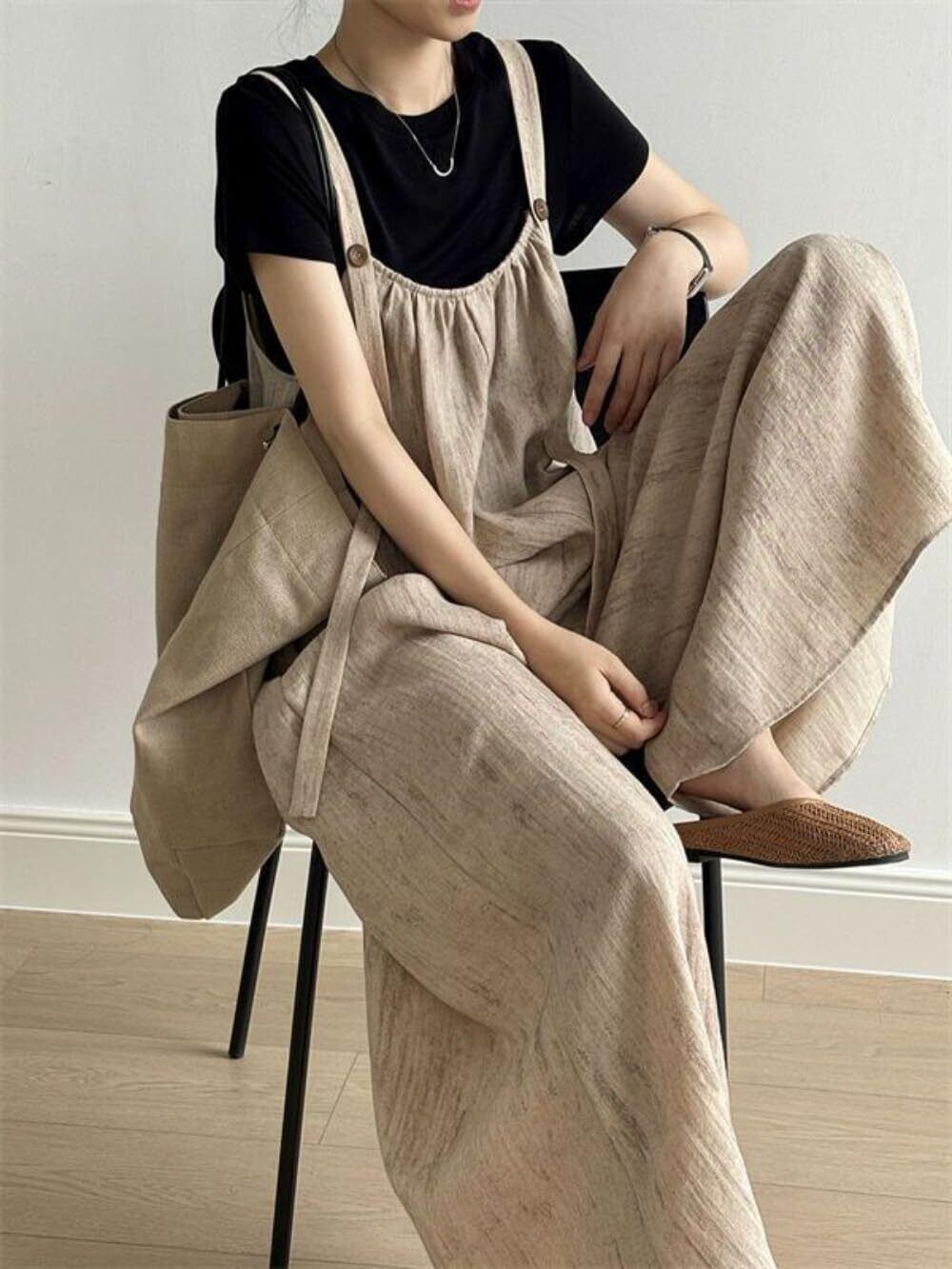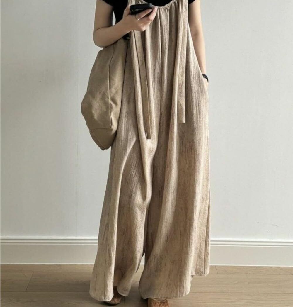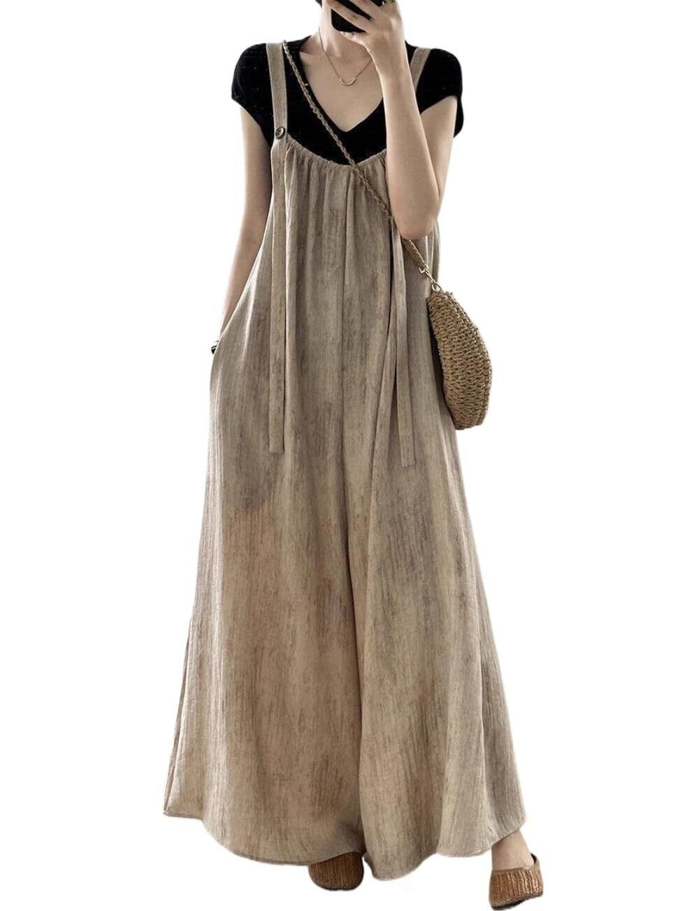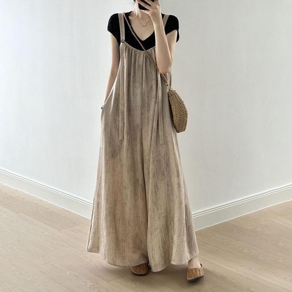 [Patypeety] オールインワン サロペット ワイドパンツ レディース スカート 楽ちん 体型カバー ボトムス 春夏 綿麻混 マタニティ スカーチョ きれいめ 重ね着 リラックス 着痩せ 大きいサイズ ふんわり 女性 通勤 脚長 (カーキ,2XL)