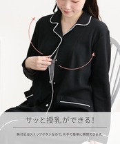 出産準備に1枚は持っておきたい前ボタン開きのデザイン。フロントは胸部分がスナップボタンになっていて、片手でカンタンに開けられます
