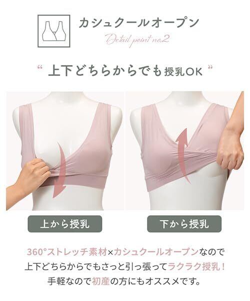 たて・よこ・ななめ360度に伸びるストレッチ素材で妊娠・出産で大きくなるバストにやさしくフィットします。「これからもまだまだ大きくなりそう」「今のバストサイズがわからない」などサイズ選びに迷っている妊婦さんやママに最適なブラ。授乳は上からでも下からでも素早く簡単に授乳できます。アンダー部分はゴム不使用でほどよくフィットし、締め付けが苦手な方やつわりでしんどい方にも。通気性の良いメッシュ素材なのでムレやすい時期にもサラッと快適です。肩紐はタンクトップ型なので、チラ見えもOK。Tシャツなどトップスにも響きにくい。