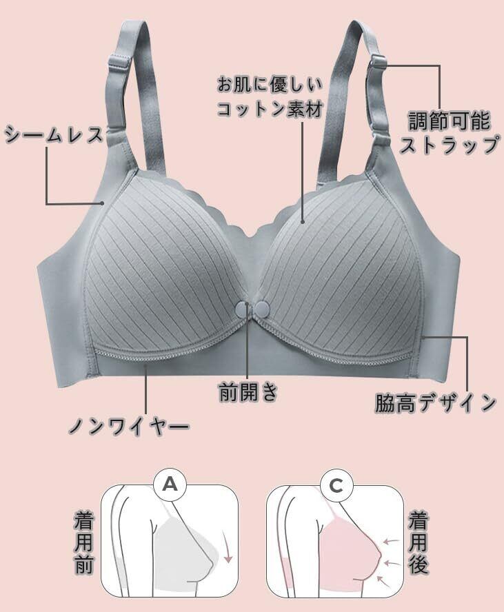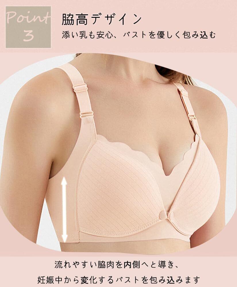 【ストレスフリーなのに安定感】脇高設計+3点立体縫製で妊娠中重くなった胸を下&横からバッチリ支え、脇や背中に圧力をかからないノーワイヤ&シームレスデザインなのに、垂れ防止してくれます。脇背中もスッキリ見せます。