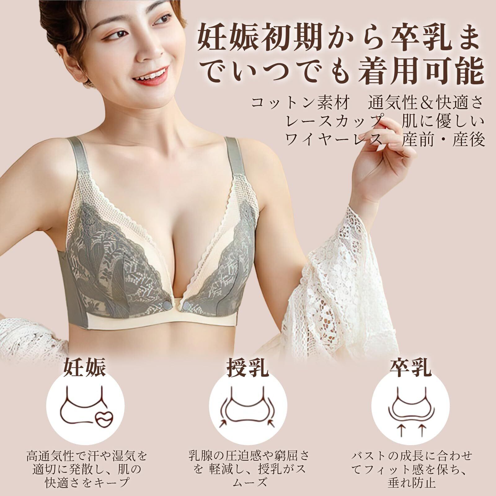 4.【産前・妊娠中・産後授乳期にも対応】マタニティブラは伸縮性に 素材を使用しており、胸を圧迫しません。 ブラジャーの後ろバックルは4段4列に調節可能で、妊娠中から産後の大きなバストサイズの変化に対応します。 伸縮性のある生地なので、長期間の使用にも耐えられます。