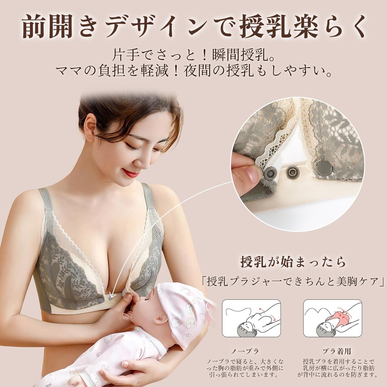 2.【前開き授乳ブラ】ボタンデザインで着脱しやすく、授乳も楽々。 前肩と前脇部分にはストレッチ裏地を内蔵し、バストを引き締める構造です。 縫い目が肌に触れにくく、柔らかな肌触りもポイントです。