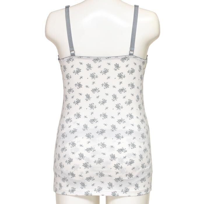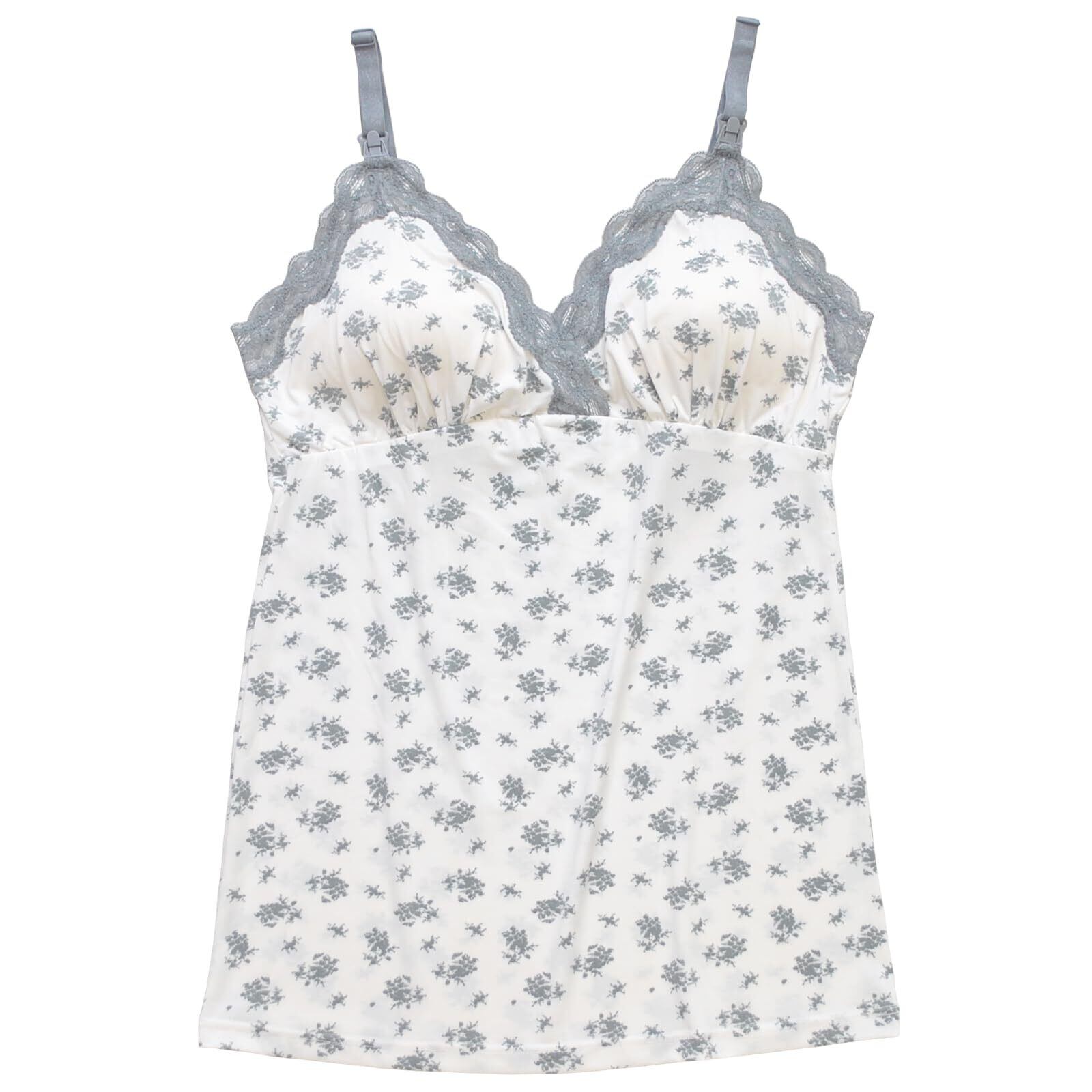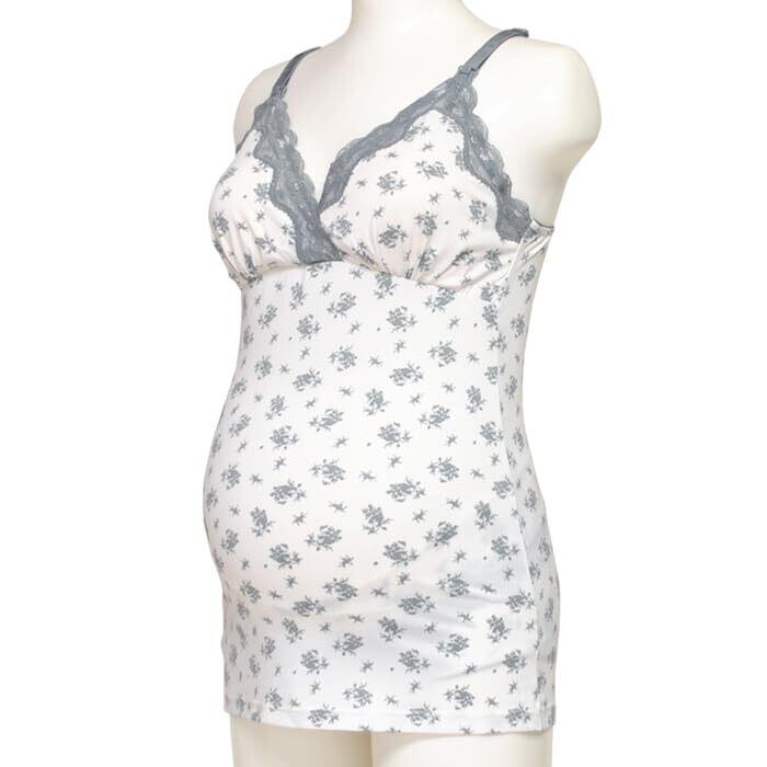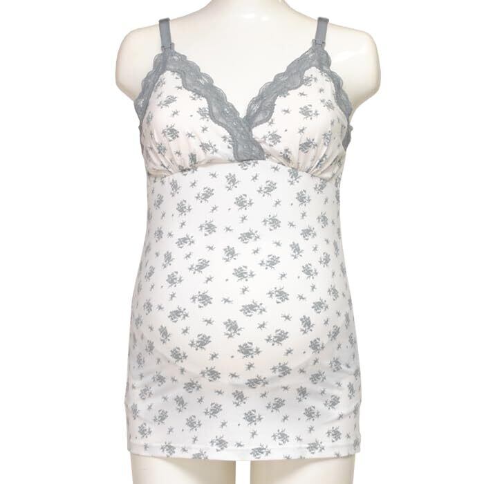 襟ぐり袖ぐりに贅沢なレースをあしらったカップ付き授乳キャミソール