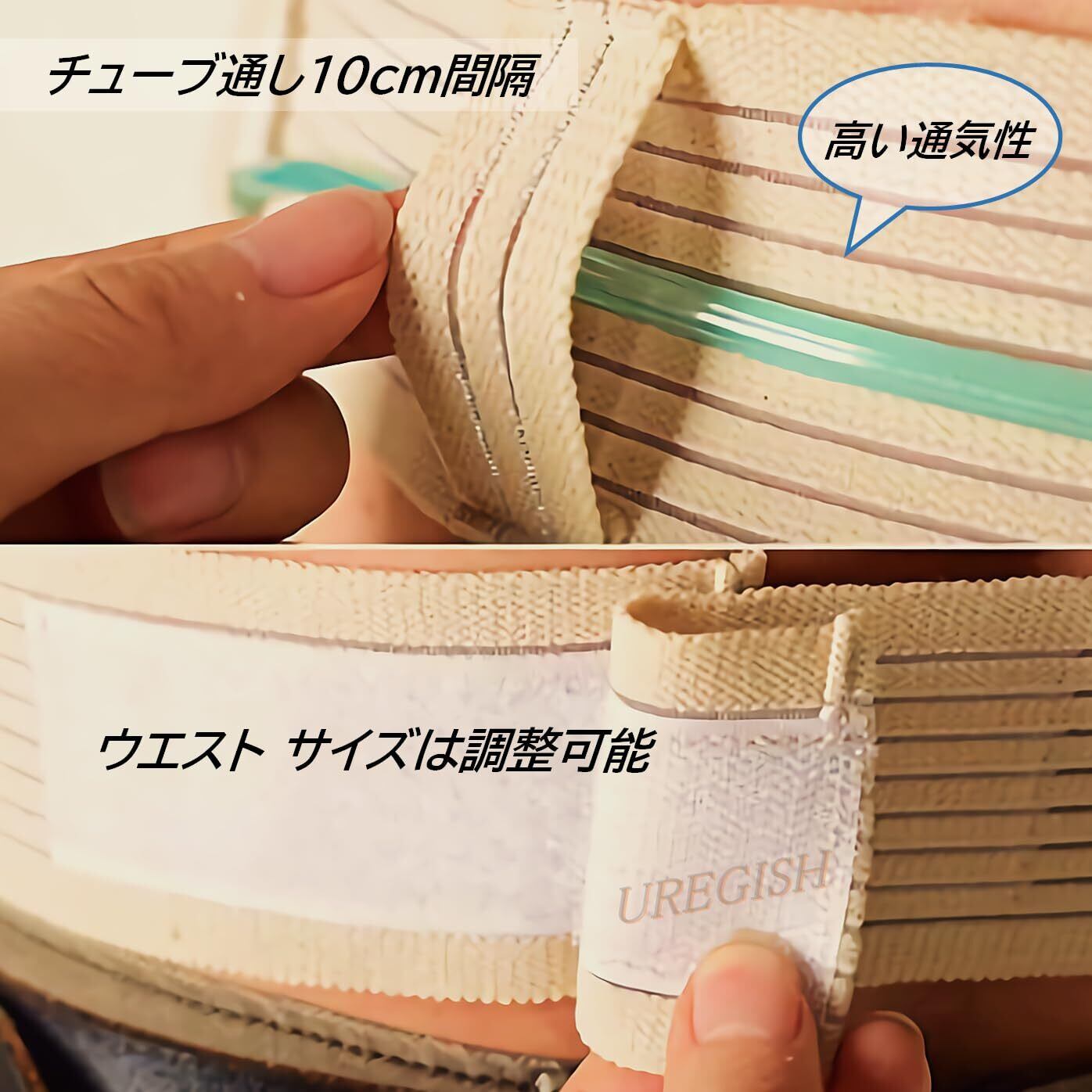 高い通気性を実現するため帯にはスリットが8本入っています。チューブ通しは、概ね10cm間隔で設けられています。