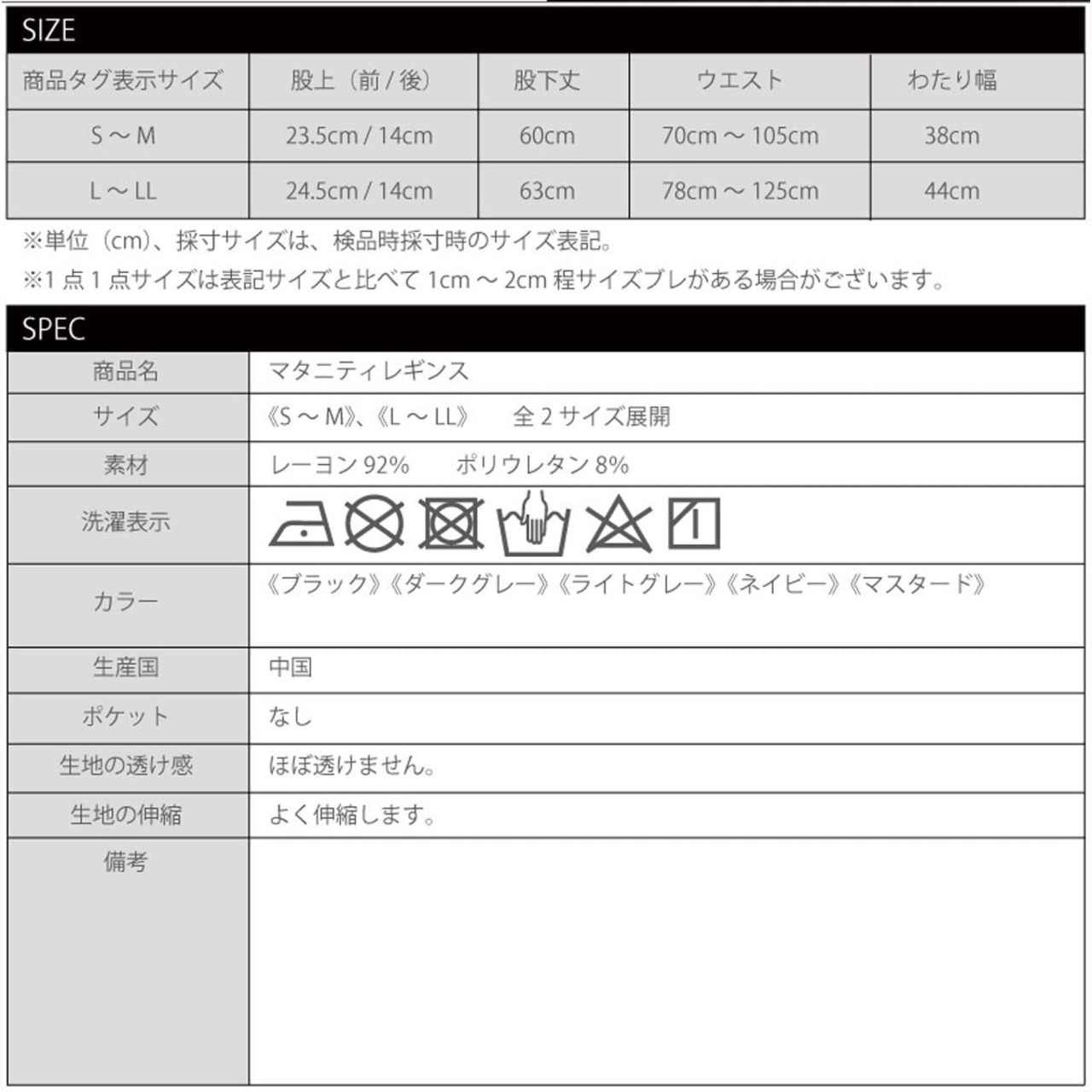 white check mark【商品名】らくらくマタニティレギンス 【素材】レーヨン92% ポリウレタン8% 【サイズ】S~M、L~LL(2サイズ) 【カラー】ブラック、ダークグレー、ライトグレー、ネイビー、マスタード white check mark妊娠中は悩みがいっぱい。妊娠中はお腹の冷えが気になる。。。妊娠中は肌に優しい素材がいいな。。。妊娠中は運動不足になりがち。。。妊娠中もおしゃれがしたい。。すぐにお出かけできるようにしたい。。。急な来客でも恥ずかしくない、だけど楽なゆったりしたおしゃれがいいな。 white check markPoint①しっかりした伸縮性のある生地、動きやすく楽に着用できます。体型が日々変化する妊婦さんにはおススメ、締め付けが苦手な方にもおススメです。 Point②肌触りのよいレーヨン素材。リブ素材でストレッチ性もあり履きやすい素材です。パンツのインナーパンツとしても活躍。 white check markPoint③お腹全体を覆うゆったりしたサイズでお腹の冷えから守ります。Point④【S~M】ウエスト70㎝~106㎝【L~LL 】ウエスト78㎝~125㎝までウエスト、お腹を締め付けないゆったりサイズ。Point⑤ウエスト部分にサイズ調節できるゴムとボタンで出産後もサイズ調節して着用できます。⑥いろいろなシーンで活躍するレギンス white check mark【サイズ】【S~M】股上丈(前/後)23.5㎝/14㎝ 股下丈 60㎝ ウエスト 70㎝~105㎝ わたり幅 38㎝ 【L~LL】股上丈(前/後)24.5㎝/14㎝ 股下丈 63㎝ ウエスト 78㎝~125㎝ わたり幅 44㎝