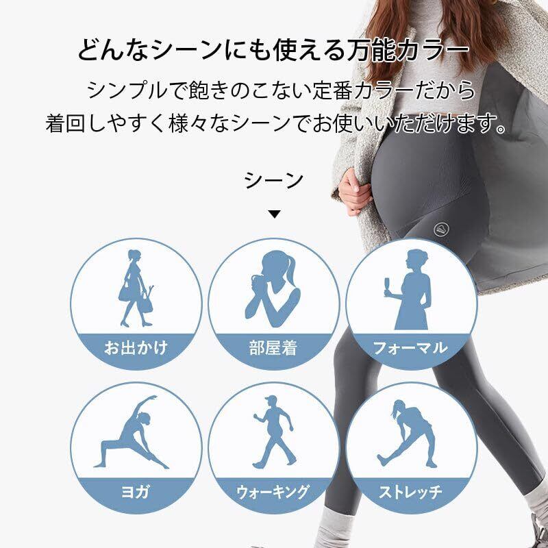 【妊娠初期~出産後まで使える】 お腹全体を覆うゆったりしたサイズでお腹の冷えから守ります。体型が日々変化する妊婦さんにはおススメ。妊娠期間中はもちろん、出産後もファッションレギンスとしてそのまま着用いただくことができます。