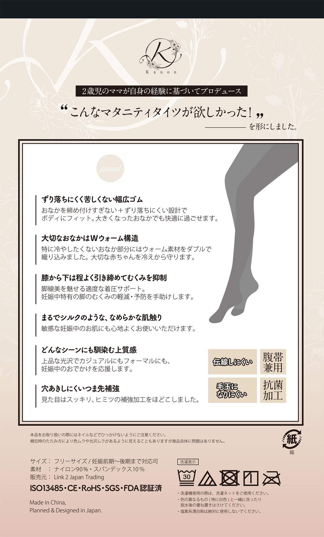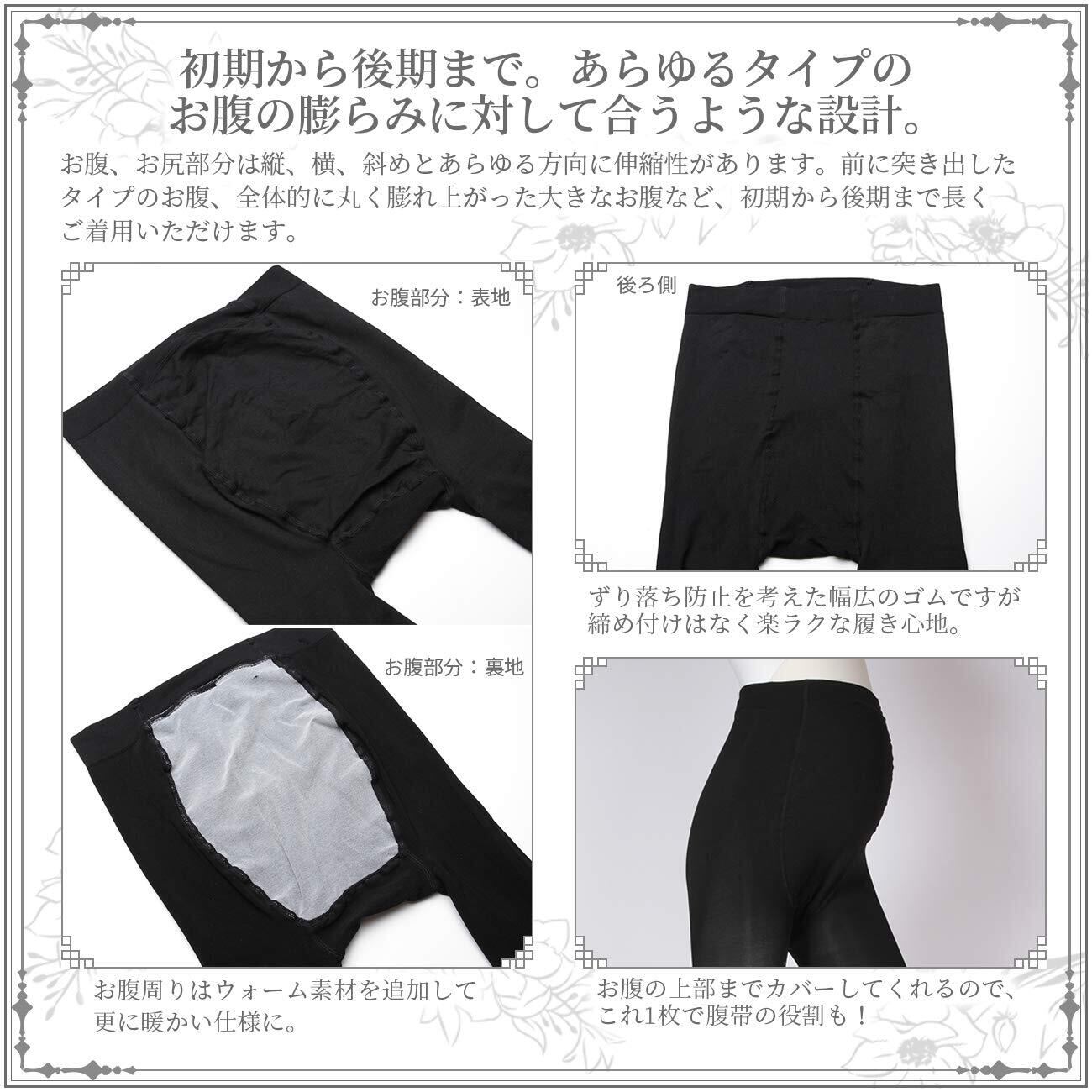 【あったかマタニティータイツ】とにかく暖かさと美しさにこだわった120デニールのマタニティータイツ。ファッション性を保ちつつ、しっかり厚手で、大事なお腹の赤ちゃんを冷えから守ってくれます。2歳児のママが「こんなマタニティーアイテムがあったら良かった」を形にしました。 【快適な履き心地】伝線しにくく、毛玉もつきにくい滑らかな肌触りのツルツル素材。通気性が良く蒸れずに着用でき、肌が敏感になりやすい妊娠期、痒みが出やすい方にもオススメ。抗菌加工で気になるにおいを防ぎ、ブーツなどのオシャレも楽しめます 【スッキリ美脚効果】脚部分は妊娠中の脚のむくみを軽減、予防してくれる適度な引き締め&着圧感。体のラインにフィットしてダブつかず、上品な光沢で脚がキレイに見えますよ穴のあきにくい補強トウは、見た目はヌーディに近いので見えてもスマート。 【ほどよい伸縮性】お腹の履き口のゴムの部分はずり落ち防止を考えながらも、締め付け過ぎで気分が悪くなりにくいような幅広の仕様。縦、横、斜めのどの方向にも伸縮性があるので、あらゆるタイプのお腹の膨らみに対して合うような設計になっています。 【腹帯として】お腹部分は追加でウォーム素材を入れている為、更にあったか。お腹の上部までカバーしてくれるので、これ1枚で腹帯の役割も!ズレる・かさばるなどのデメリットを解消し、妊娠初期から後期までをサポートします。 【カラー】ブラック 【サイズ】フリーサイズ