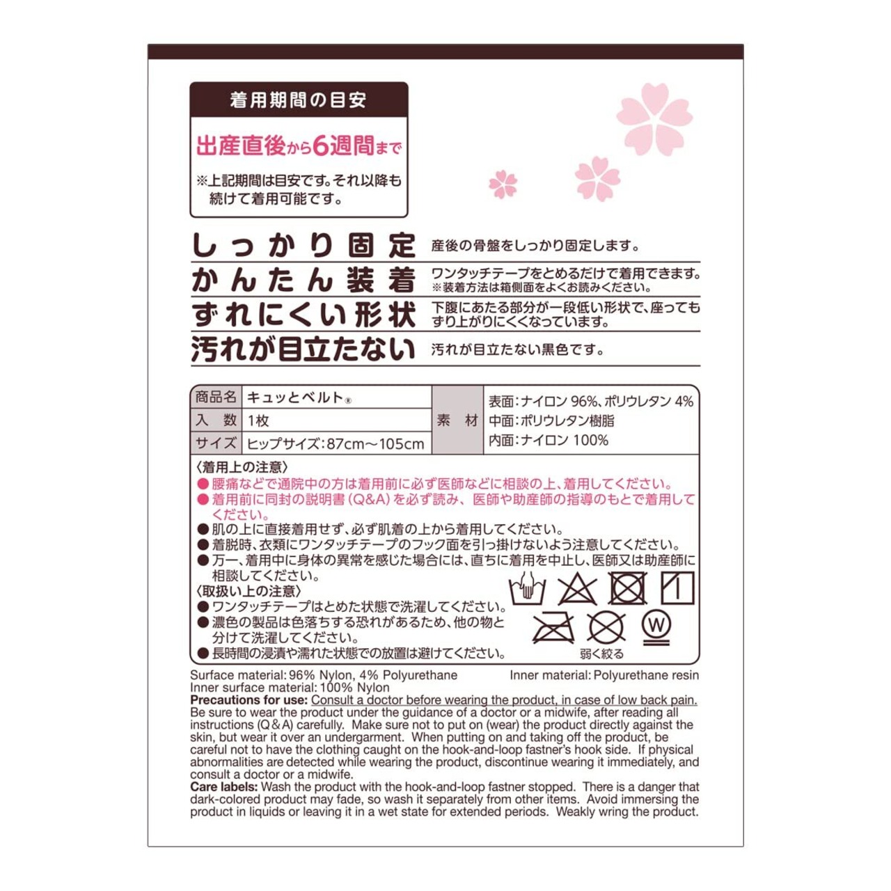 商品説明「キュッとベルト 1枚入」は、伸縮性のある生地が産後の緩んだ骨盤をキュッと支える、産後サポーターです。キュッと引っ張り、ワンタッチテープでとめるだけで一人でも簡単に装着できます。下腹部にあたる部分が一段低い形状で、座ってもずり上がりにくくなっています。ママの疑問に答える「産後ママの骨盤ケアQ&A」付き。装着方法1.足を揃えてベルトを前から後ろにまわし、お尻側でベルトを交差させます。2.ベルトの両端を左右に伸ばします。3.伸ばした状態で端をワンタッチテープで止めます。使用上の注意●上前腸骨棘から上を締めないでください。骨盤が開く原因になります。●腰痛などで通院中の方は使用前に必ず医師などに相談の上、使用してください。●万一、使用中に身体の異常を感じた場合には、直ちに使用を中止し、医師又は助産師に相談してください。●肌に直接使用しないで、必ず肌着の上から装着してください。●着脱時、衣類にワンタッチテープのオス部を引っ掛けないよう注意してください。ご注意●ワンタッチテープをとめた状態で洗濯してください。●色落ちする恐れがありますので、白物および淡色の物と分けて洗濯してください。●タンブラー乾燥はお避けください。着用期間の目安分娩直後-6週間(骨盤がやわらかく歪みやすい期間の装着をおすすめします。)素材ナイロン、ポリウレタン樹脂、ポリウレタン、綿
