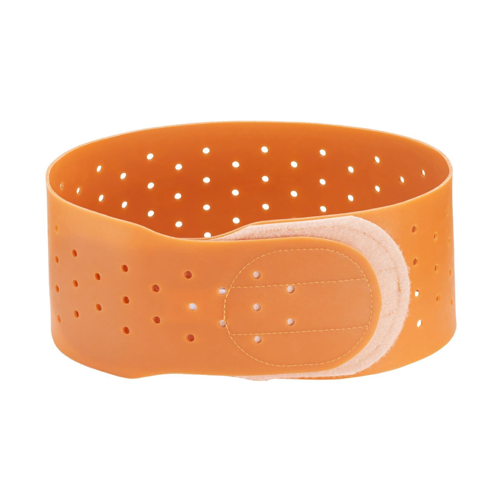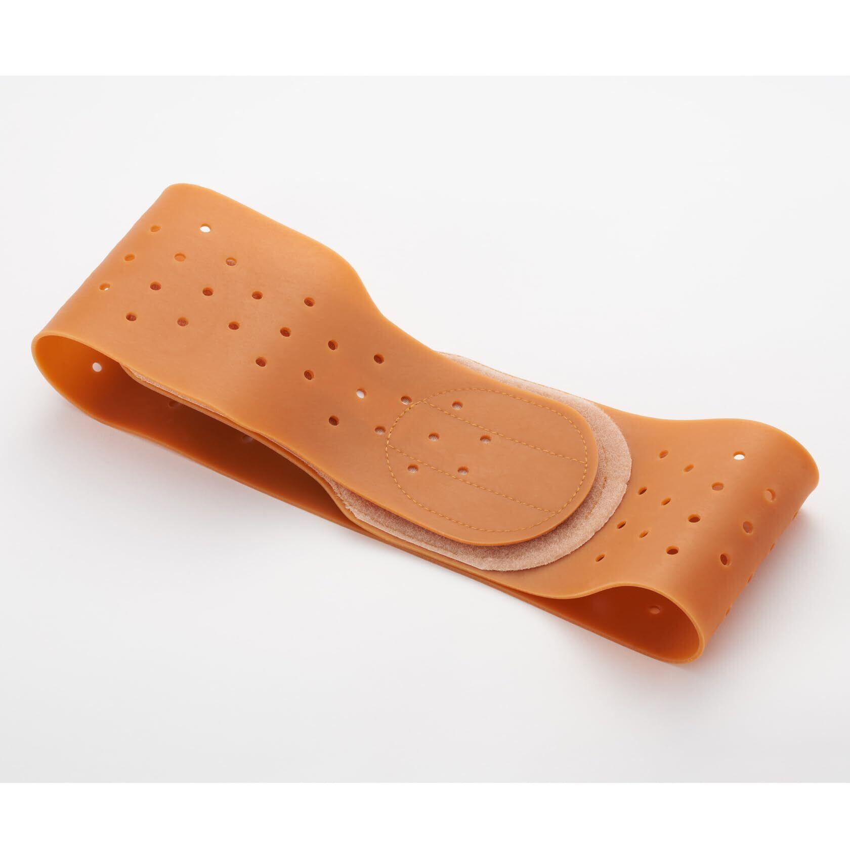 着脱簡単な天然ゴム製の骨盤ベルト。衣類にひびかない薄さ。大きめの面ファスナーで調整がしやすい。通気孔で蒸れにくい。