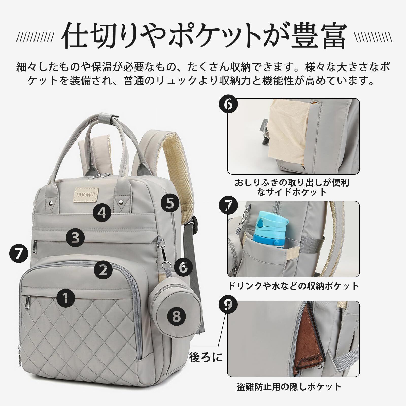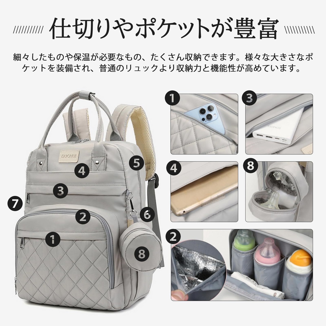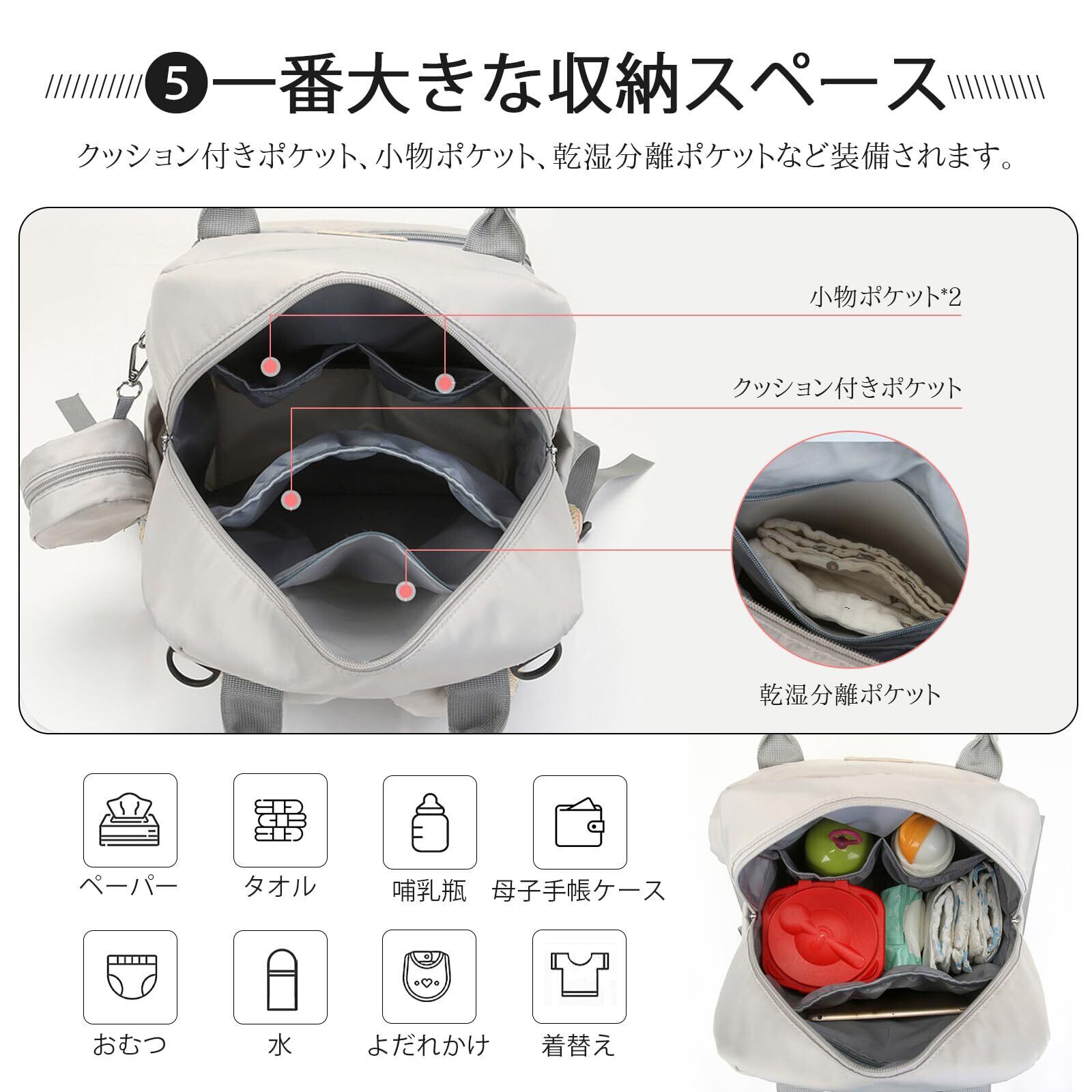 前から後ろまで、6層の収納スペースがあります。左右にゴム付きのサイドポケット付いています。付属品として、保温シートつきポーチ1個とおむつ替えシート1個を付いています。仕切りやポケットが豊富で、おむつ、着替え、哺乳瓶、財布、携帯など細々した荷物を整理整頓しやすく、迷わず取り出せます。