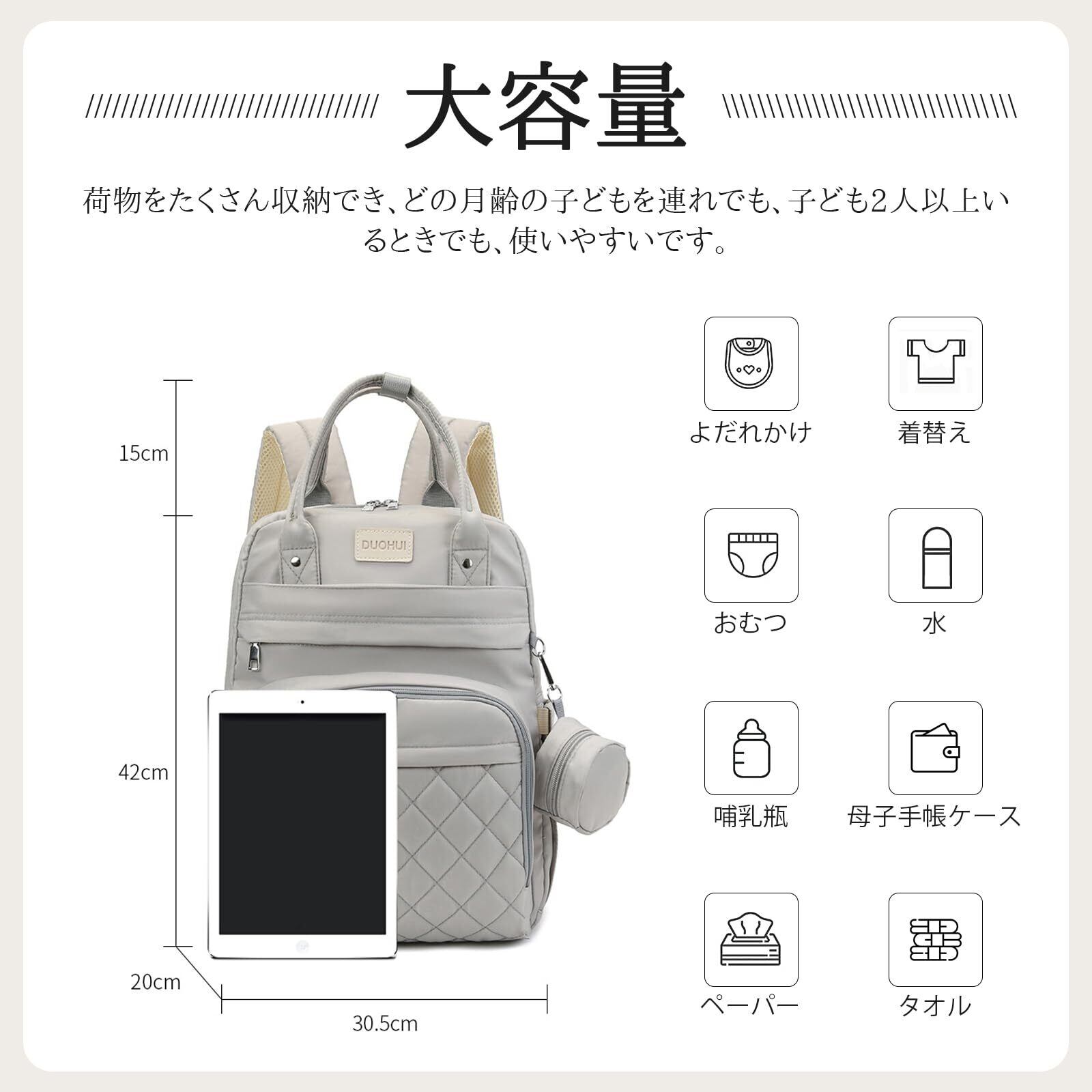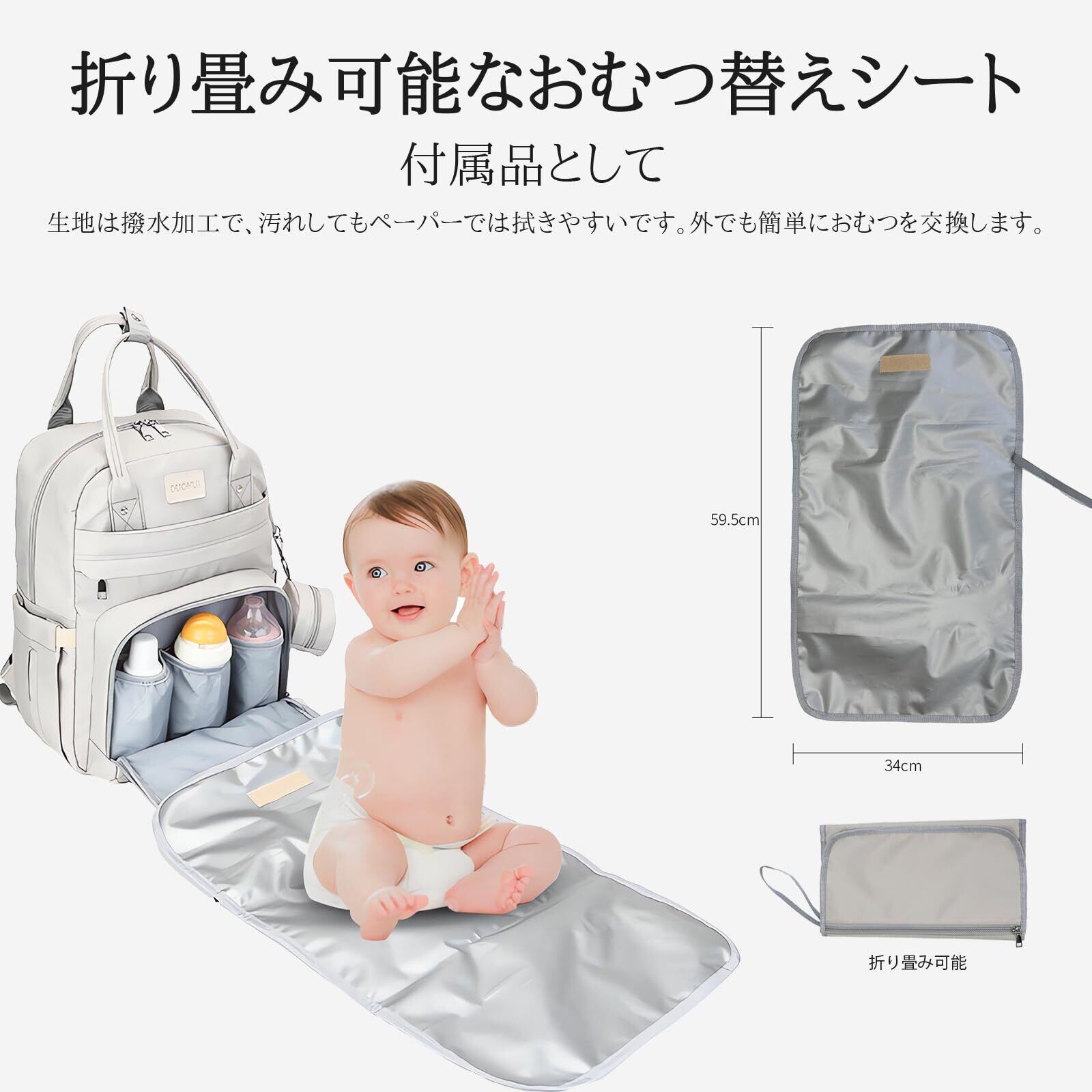 サイズ:長さ30.5cmx幅20㎝x高42cm;重さ:0.75kg;四色展開:グレー、ブルー、ピンク、ブラック;付属品:おむつ替えシート*1(長さ59.5cmx幅34㎝)、保温シート付きのポーチ*1。商品の品質に万全を期待しておりますが、万が一お届けした商品は破損、汚損などが発生しましたら、ご連絡お願いします。誠心誠意対応いたします。