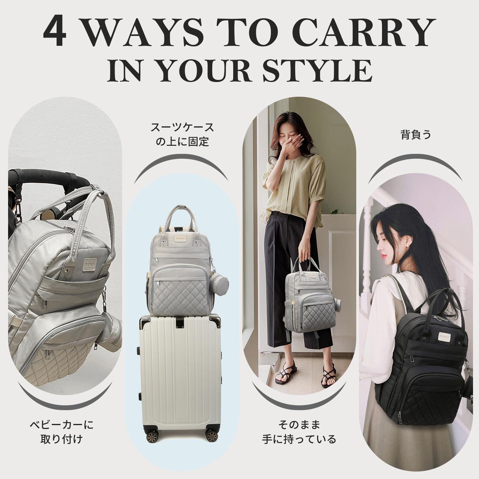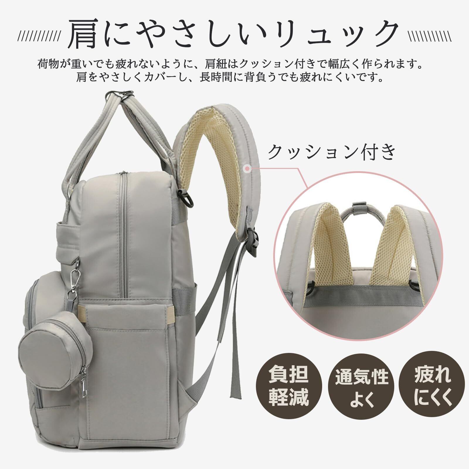 荷物が重いでも疲れないように、肩紐はクッション付きで幅広く作られます。肩をやさしくカバーし、長時間に背負うでも疲れにくいです。またご都合によって、ベビーカーに取り付けやスーツケースの上に固定することもできます。