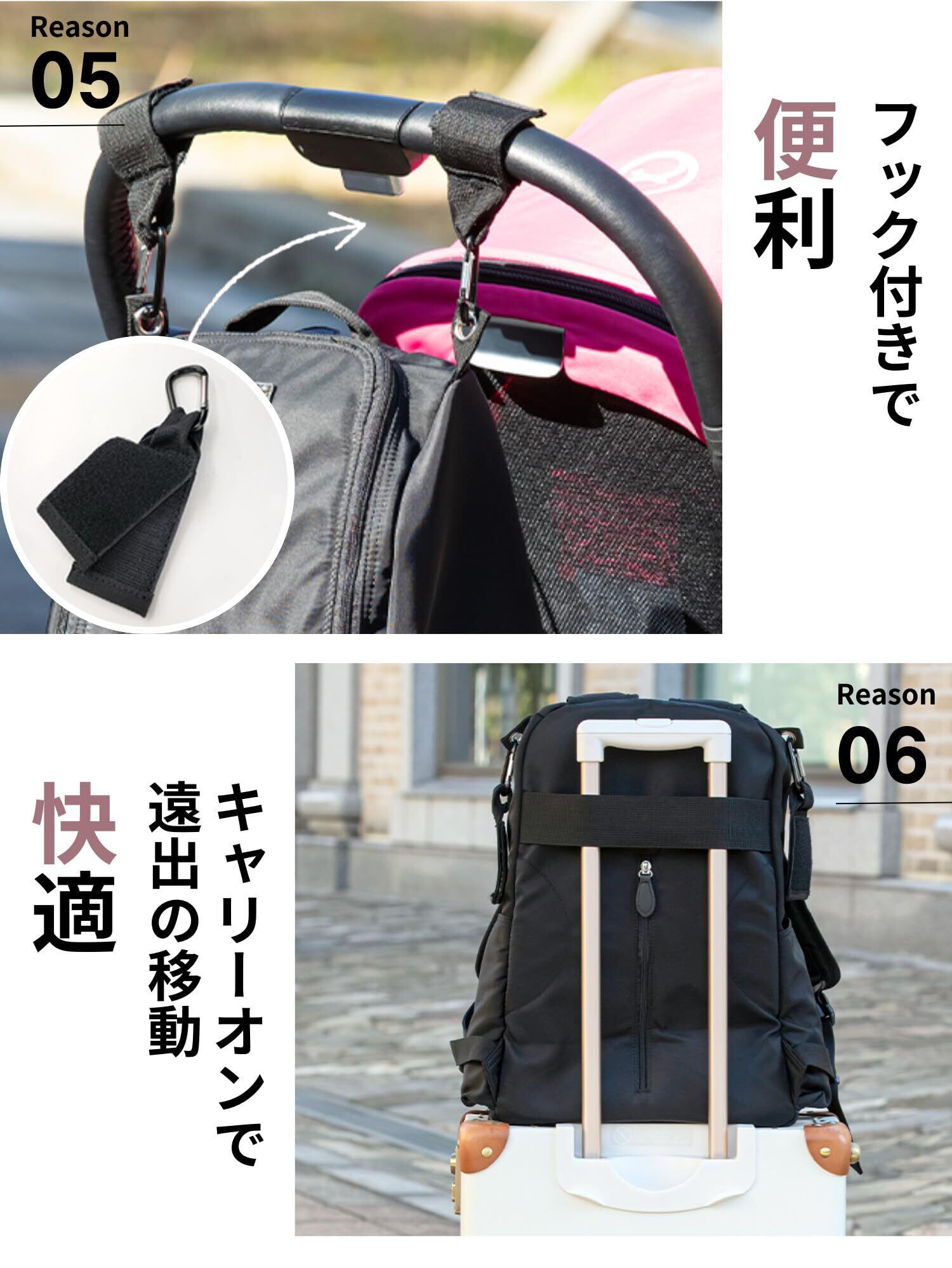 【おすすめポイントいっぱい!】①パパも兼用しやすい、スタイリッシュなデザイン!②整頓しやすい10ポケットで使い心地も抜群汚れにくい③安心の撥水加工(ナイロン素材は強撥水、キャンバス素材は内側撥水)④抱っこ紐をしたまま、バックルを外すだけでリュックがおろせる⑤中身が取り出しやすい自立型⑥背負ったまま取り外し可能な背面ファスナーは盗難防止にも⑦キャリーケースにオンできるベルトつき⑧取り外し可能なベビーカーフックつき⑨樹脂ファスナーでベビーの素肌を傷付けにくい