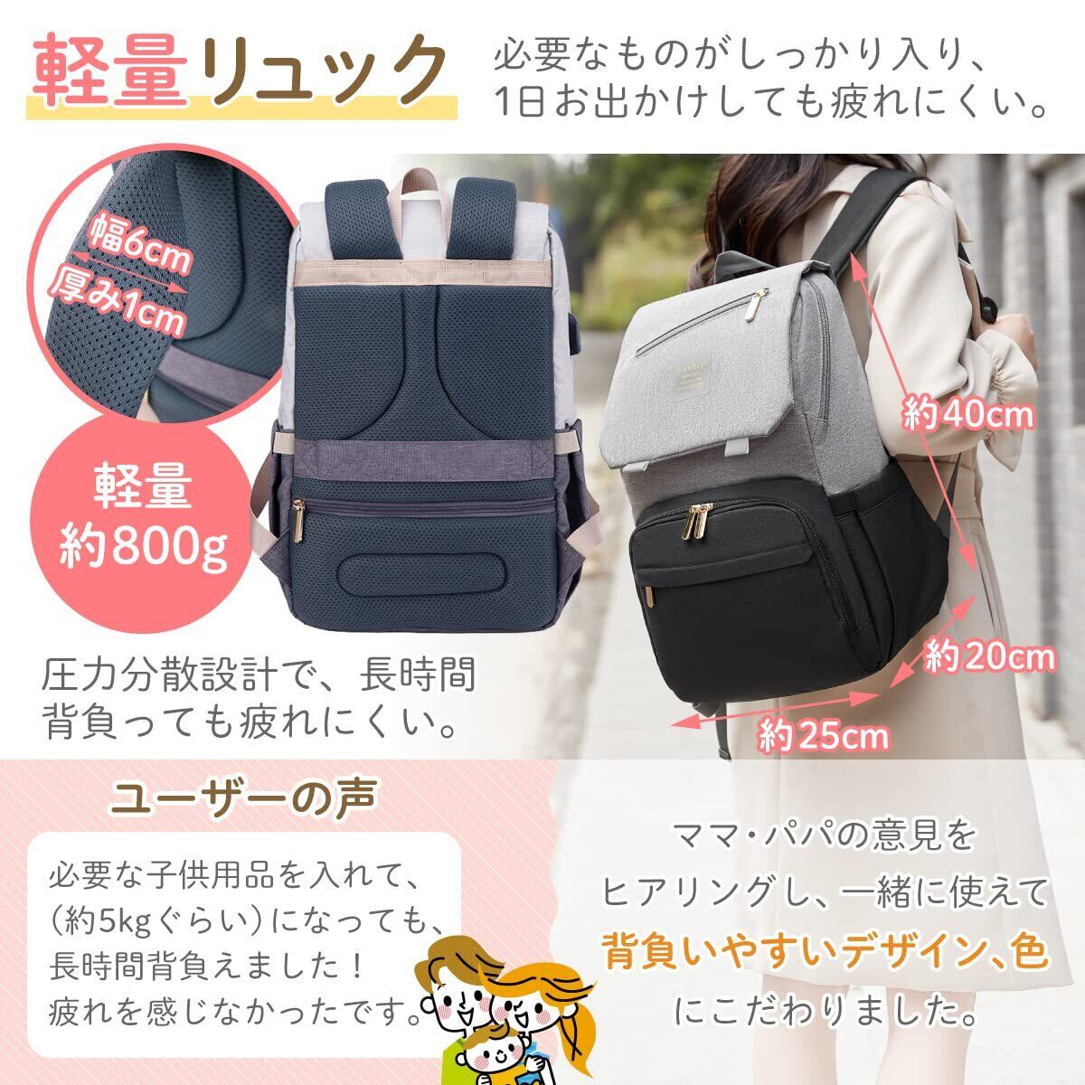 【使いやすく、軽い!ママと子供のおでかけをサポート】ママの理想を詰め込んだおしゃれなマザーズリック。軽量なのに大容量、長時間背負っても疲れにくい、多機能なポケット、洋服に合わせやすいおしゃれなリュックです。