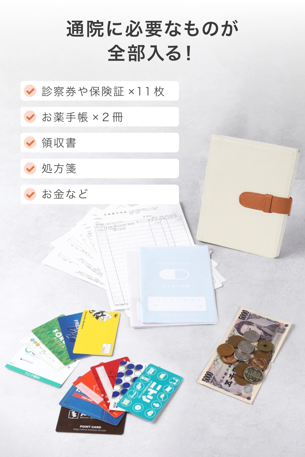 【通院に必要なものが全部入る!】 診察券 や 保険証 ×11枚、 お薬手帳 ×2冊、 領収書 、 処方箋 、 お札 、 小銭