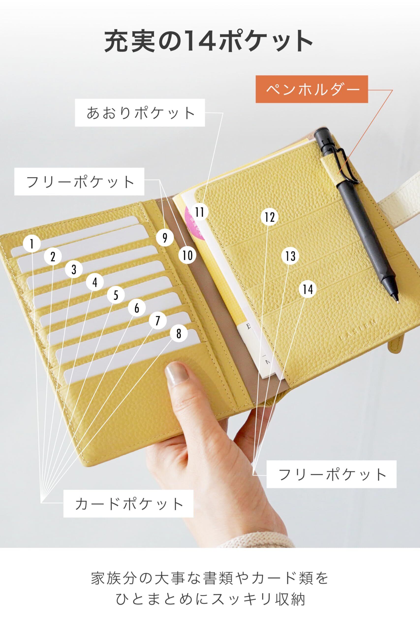 【見開きで一目瞭然】充実の14ポケットで 診察券 や 保険証 などをまとめて収納!右側のあおりポケットは お薬手帳 も出し入れしやすい設計に!・8つの カードポケット と2つのフリーポケット・3つのフリーポケットとあおりポケット(Point) ペンホルダー 付きで ペン も便利に持ち運び