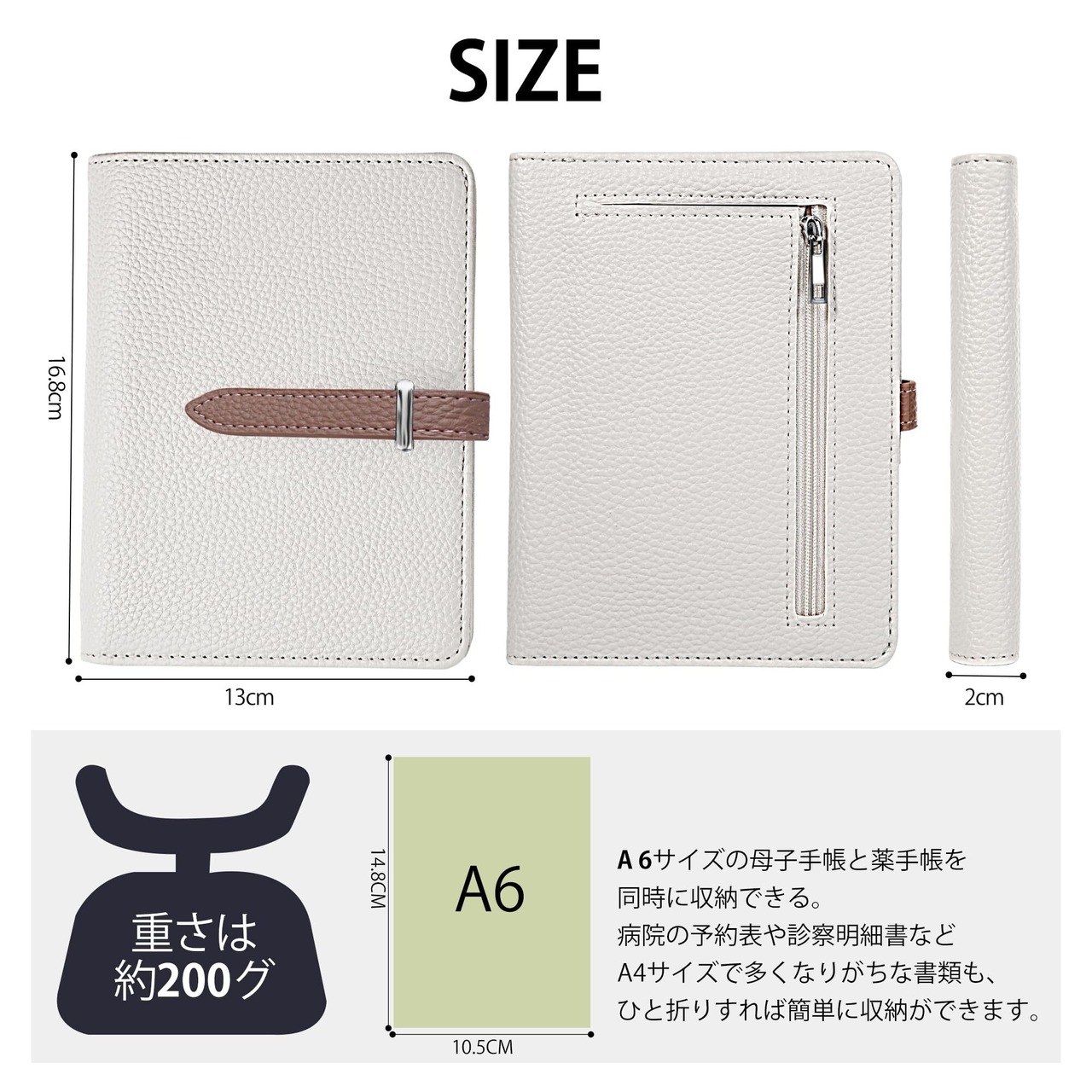 薄型コンパクトだけど大容量:A6サイズ対応!薄型で使いやすいサイズ感ですが、通院時に必要なものがまとめて収納可能な大容量。病院の予約表や診察明細書などA4サイズで多くなりがちな書類も、ひと折りすれば簡単に収納ができます。