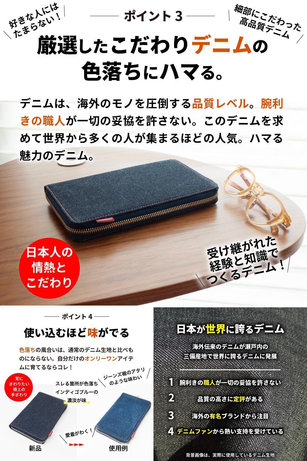 職人が手間暇を惜しまず作り出す藍染めの美しい色は、使い込んだ「色落ち」の風合いや表情も一般的なデニム生地とは比べものにならない。。摩擦でデニムが最高の色落ちをして自分だけのオンリーワンアイテムに育つのも魅力のひとつ。通常ありがちなチープ素材のファッション小物は使い込むと使用感がハンパなくすぐボロボロなりますが、当商品は、デニム素材のスレ感で逆に味が出て愛着がUP。独特の深みがある経年変化の風合いはよくあるデニム素材とはモノが違う。