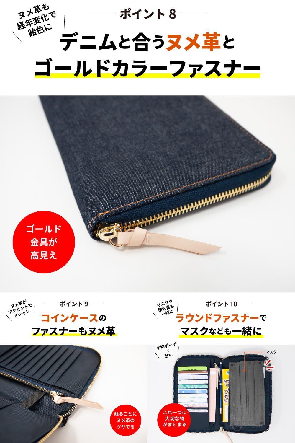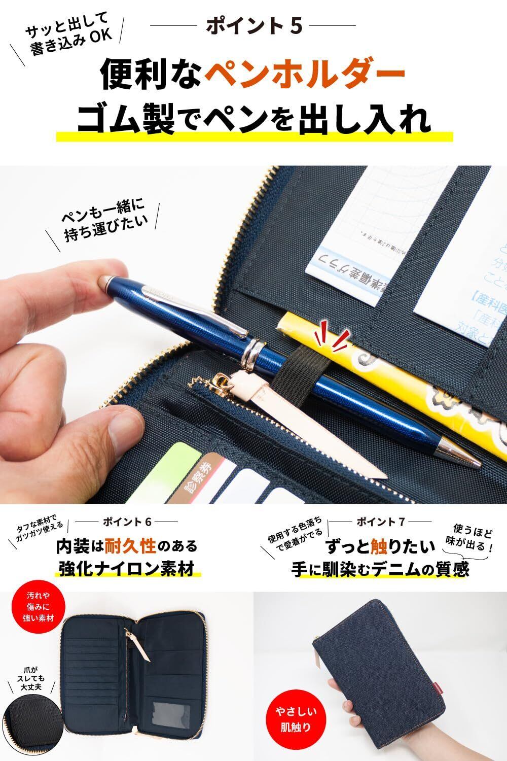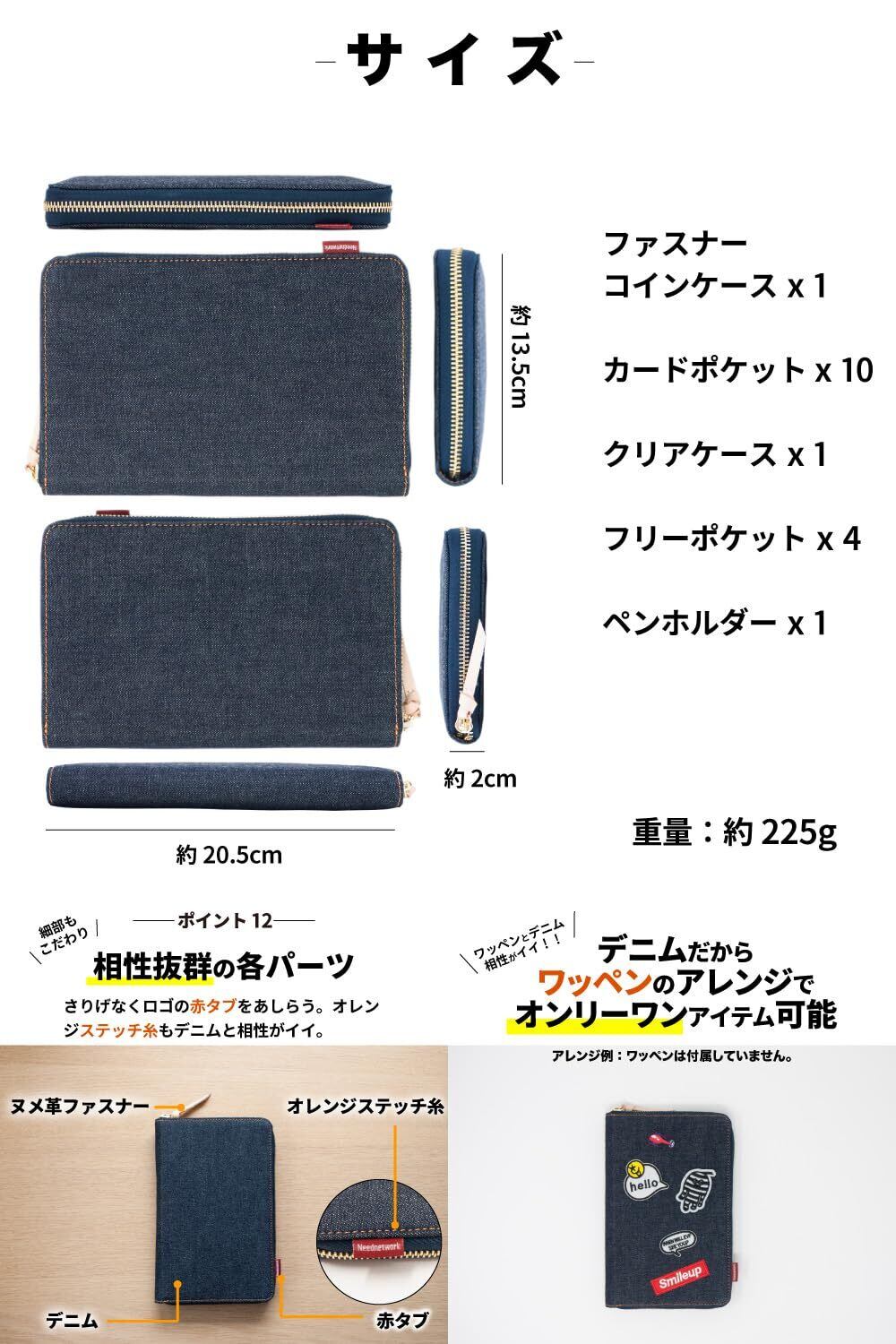 【デニム好きには、たまらない】あなただけの色落ちを楽しむ。母子手帳ケース母子手帳、お薬手帳、診察券、保険証など1つに▶︎診察券などカードすっきり。カード×フリー×コイン収納▶︎整理しやすいマルチケース。世界でも名高い日本製デニムから厳選したデニム生地を使用した母子手帳ケース ▶︎この高品質なデニム生地は、海外のモノを圧倒する品質レベル。腕利きの職人が一切の妥協を許さない使い込むほど味が出る ▶︎色落ちの風合いは、一般的なデニム生地と比べものにならない。自分だけのオンリーワンに育てるならコレ。便利なペンホルダー▶︎サッと出して書き込みOK。内装は耐久性のある強化ナイロン素材▶︎タフな素材でガツガツ使える。デニムにあうヌメ革とゴールドカラーファスナー▶︎ヌメ革も経年変化で飴色に。サイズ、 横 約20.5cm 縦 約13.5cm 厚さ 約2cm ■重量、約225g