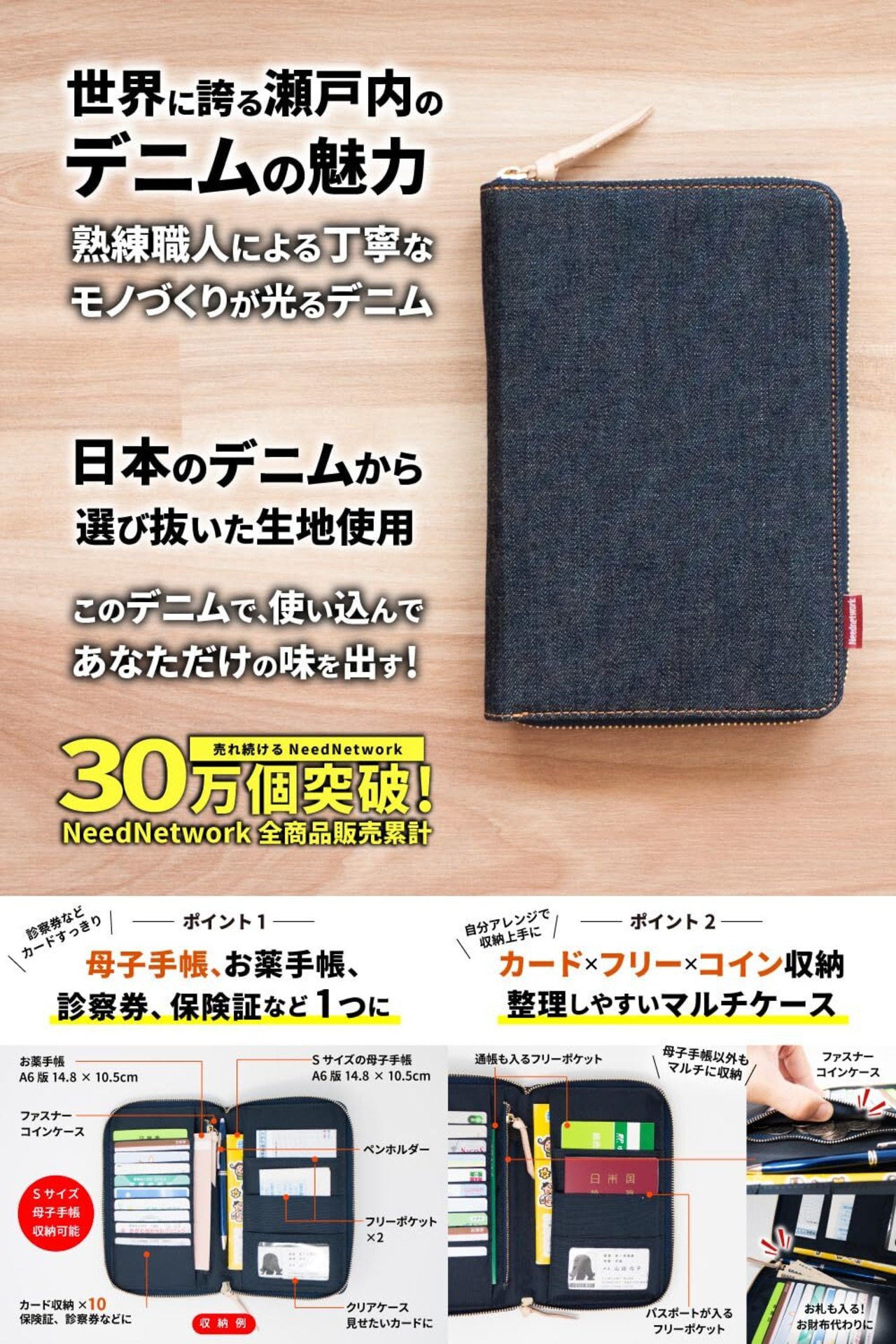[ニードネットワーク] 母子手帳ケース マルチケース 日本が誇るデニム お薬手帳ケース パスポートケース カードケース インディゴブルー