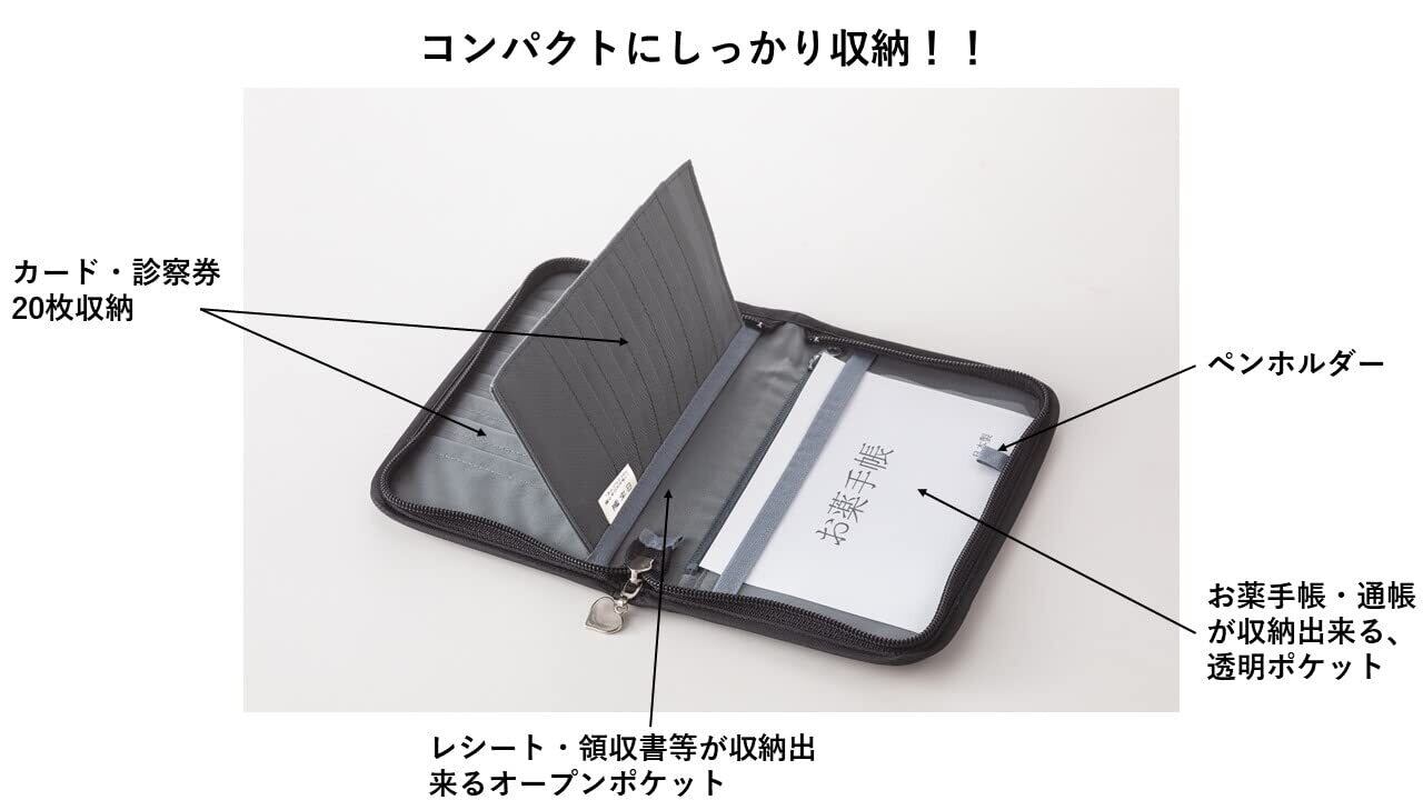 【内部】診察券サイズ入れ×8 カードサイズ入れ×12 オープンポケット×1 窓付き×1 ファスナー×1 ペンホルダー×1