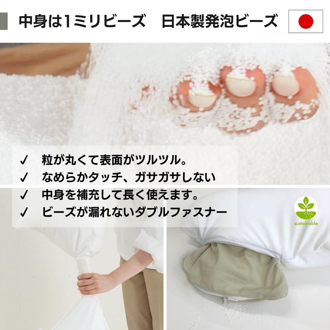 中袋素材 ポリエステル94% ポリウレタン6% 自社の中国工場で縫製しています。 極小ビーズのさらさらな感触を最大限体感できます。ポリエステルは丈夫で、固くてしっかりしたさわり心地です。 中材 極小ポリスチレン発泡ビーズ ビーズは日本製原料を使用しています。優れた流動性で身体にフィットします。ビーズのきしむ音がしにくく、臭いが少ないです。 岡山の自社工場で発泡して中詰めしています。 発泡したビーズの大きさ/粒径は 約0.9~1.5m/mです。
