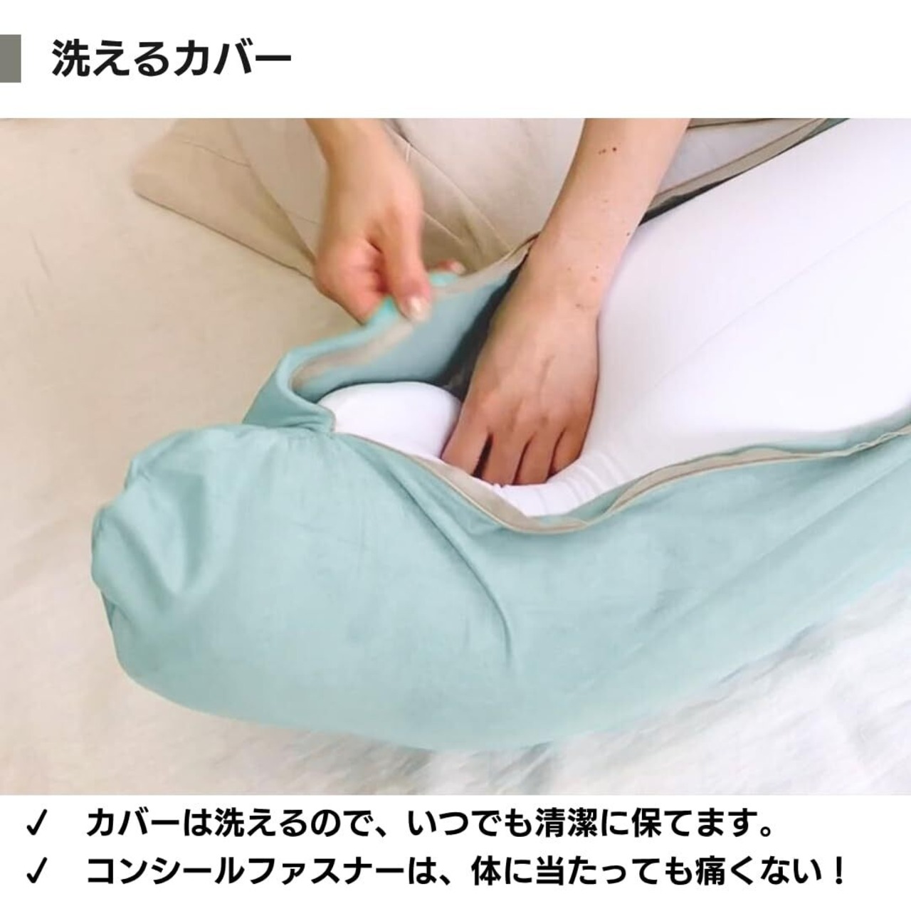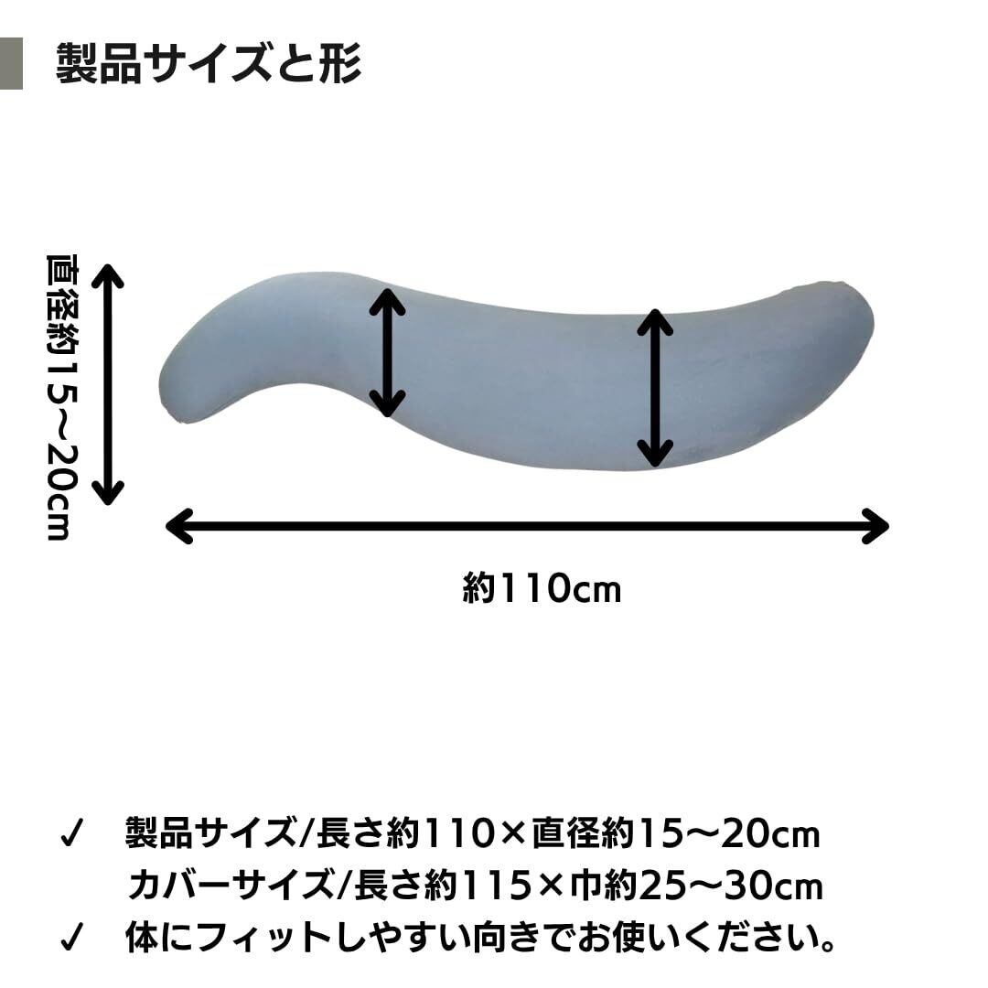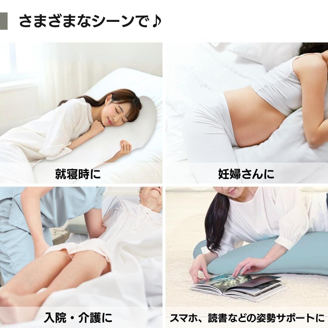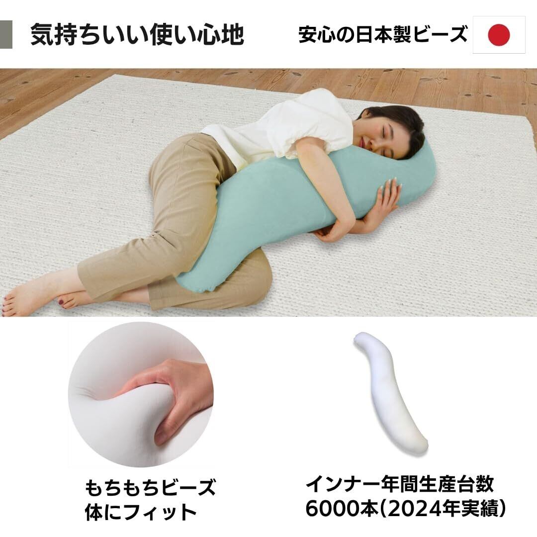 横向き寝をサポートするので、お産前の妊婦さんや、いびき軽減にもおすすめです。抱きかかえたり、背もたれにしたり、リビングでのロングビーズクッションとしてもお使いいただけます。