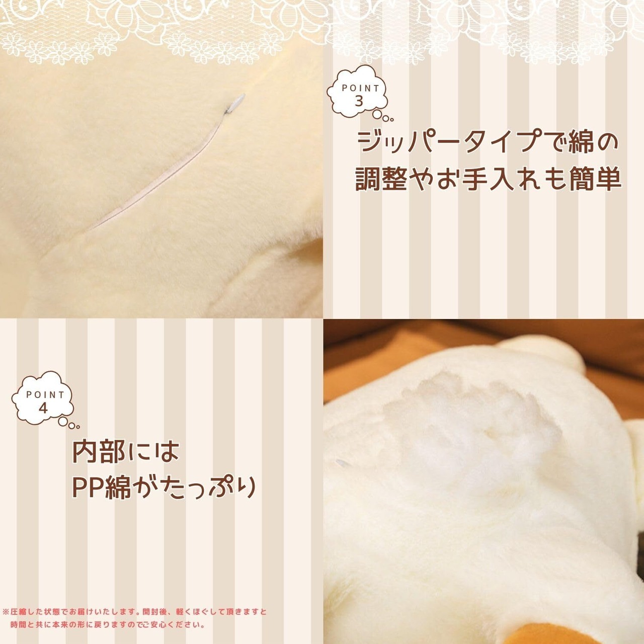 中にはPP綿をたっぷり充填してあります。またジッパータイプなので綿の調整やお手入れも簡単にできます。※圧縮した状態でお届けいたします。開封後、軽くほぐして頂きますと時間と共に本来の形に戻りますのでご安心下さい。