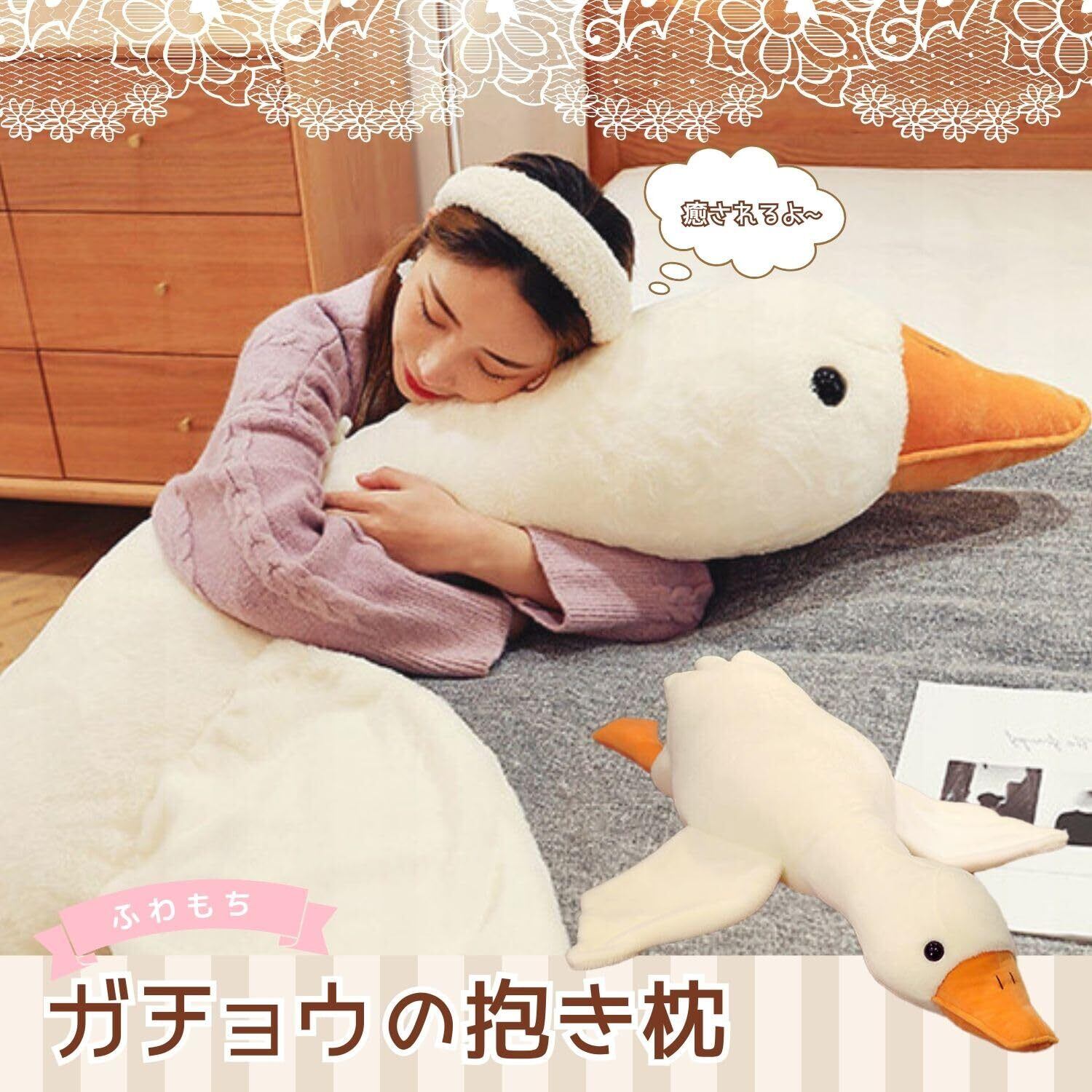 大きなガチョウの抱き枕です。癒される可愛いデザインでお部屋のインテリアに是非どうぞ。ふわふわモチモチで思わずギュッと抱きしめたくなります。