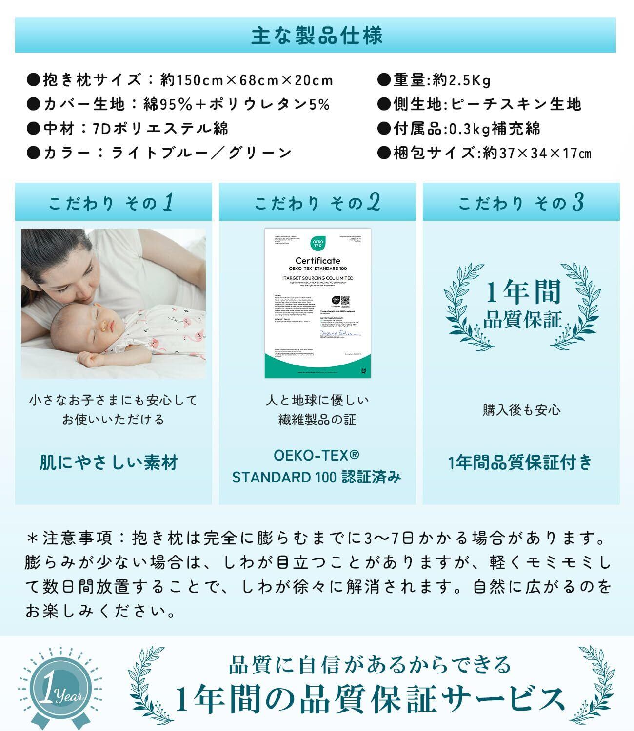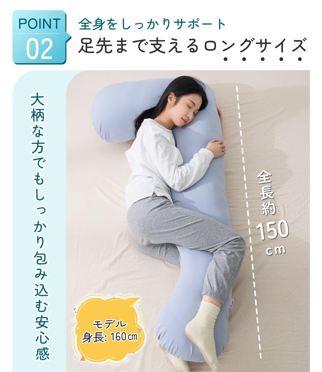 【全身を包み込む心地よさ。しっかり支える大きい抱き枕】長さ150cm・幅68cmのゆったりサイズで、肩から足元までしっかりサポート。寝返りしても余裕があり、体格の大きな方でもゆったりとお使いいただけます。