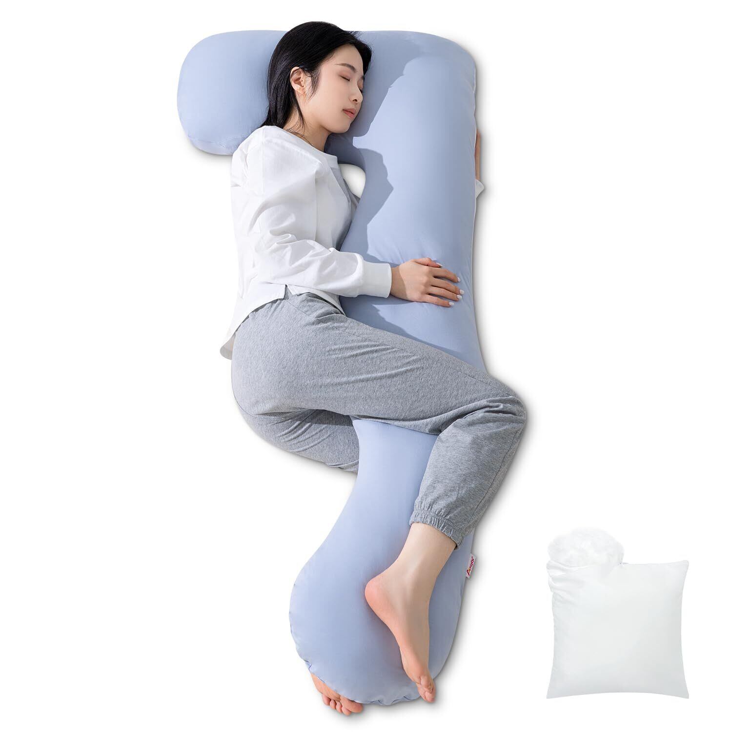 AngQi 抱き枕 だきまくら 大きいサイズ 妊婦さん対応 夏用 通気性 男性も適用 横向き寝サポート いびき防止 高さ調整可 補充綿300g付き 快眠グッズ 肌にやさしい さらさら ジャージー生地 カバー洗える L字型 7型 ライトブルー 150×68cm