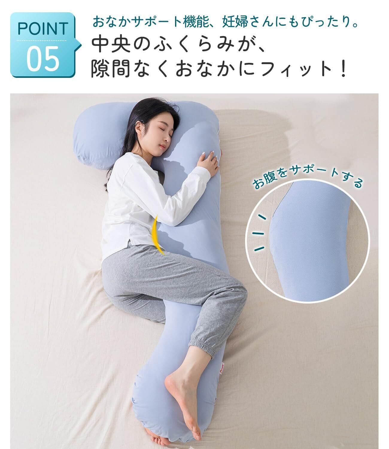 【妊婦さんにもおすすめの抱き枕】お腹が大きくなる妊娠中は、寝苦しさや腰への負担が気になる時期。AngQi抱き枕を使えば、体を横向きにして自然な姿勢をサポートでき、シムスの体位もとりやすくなります。お腹まわりをやさしく支えながら、リラックスした眠りへ導いてくれます。