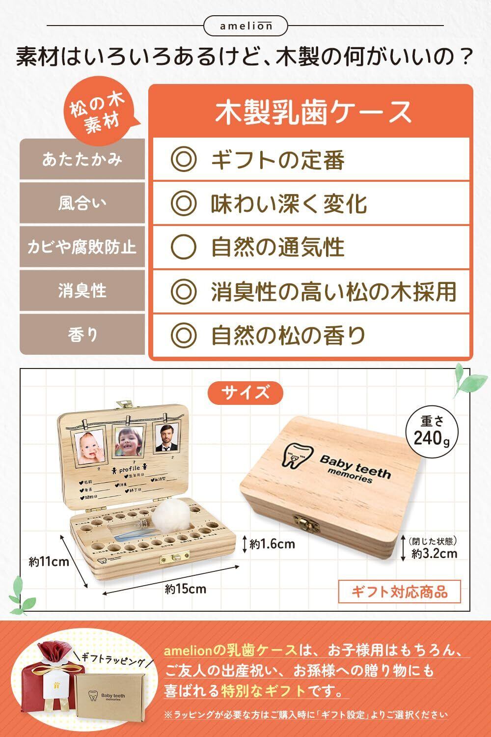 【セット内容】 乳歯ケース本体、天然の綿(天然素材を使用している為植物のカケラが入っている場合がございますが、無害ですのでご安心ください)、作業用ミニピンセット、 産毛保管用小瓶 【スペック】 ■サイズ:厚み 約3.2cm、幅 約15cm、奥行 約11cm ■重量:約240g ■材質:松の木