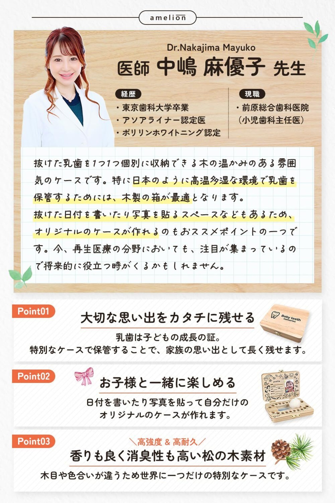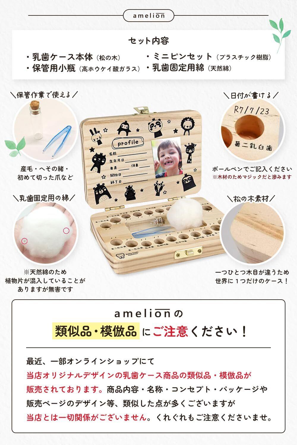 【使用方法】 プロフィール欄にお子様の情報をボールペンでご記入頂き、空いたスペースにお気に入りの写真をノリや紙用ボンドなどで貼り付けてください。乳歯を入れる穴は全20カ所あるので、乳歯が抜けたら可能な限りキレイに洗い、該当する穴に入れてミニピンセット等を使って綿で蓋をしてください。穴の上またしは下に抜けた年月日を記入していきます。髪の毛が生え始めたら、小瓶にうぶ毛を入れて、蓋をしっかりしてケース中央の窪みで保管をしてください。 <保管方法>木材の為、直射日光や多湿を避けて保管してください。 【ギフト プレゼント】 お子様には勿論、友人の出産祝いや孫へのプレゼントにも最適です。 【ご注意】当店オリジナルデザインの乳歯ケース(シンプル)のデザインをほぼ丸パクリしている偽物がございますのでご注意ください。また文字を記載していただく際は、マジックペンではなくボールペンで記載をお願いします。木材の特性上、マジックペンで記載してしまうと木に滲み文字がつぶれてしまいますのでご注意くださいませ。